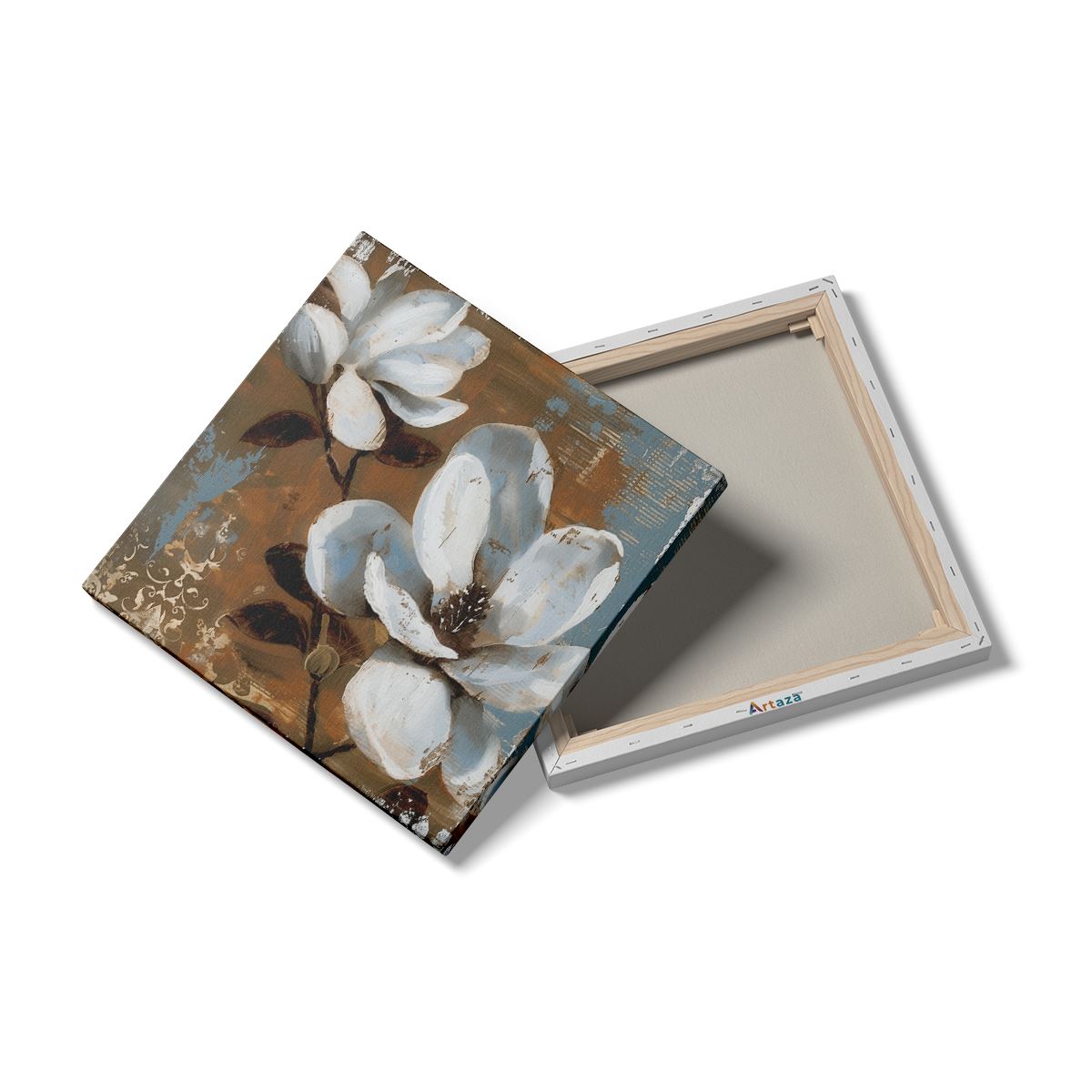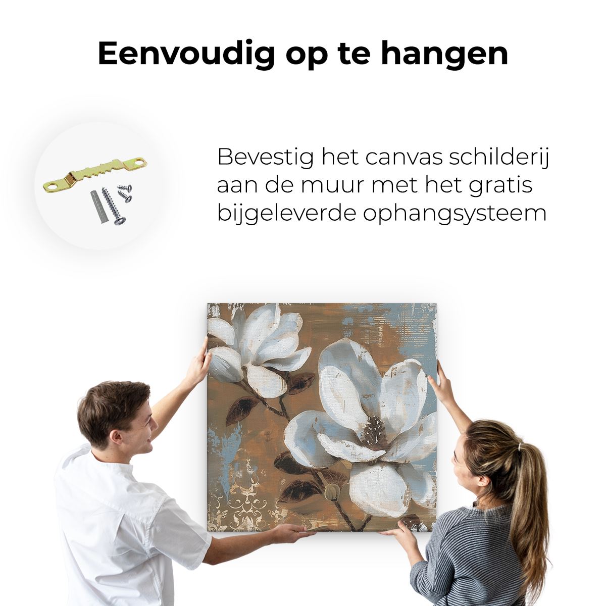 Schilderij Twee Witte Bloemen op een Bruine Achtergrond