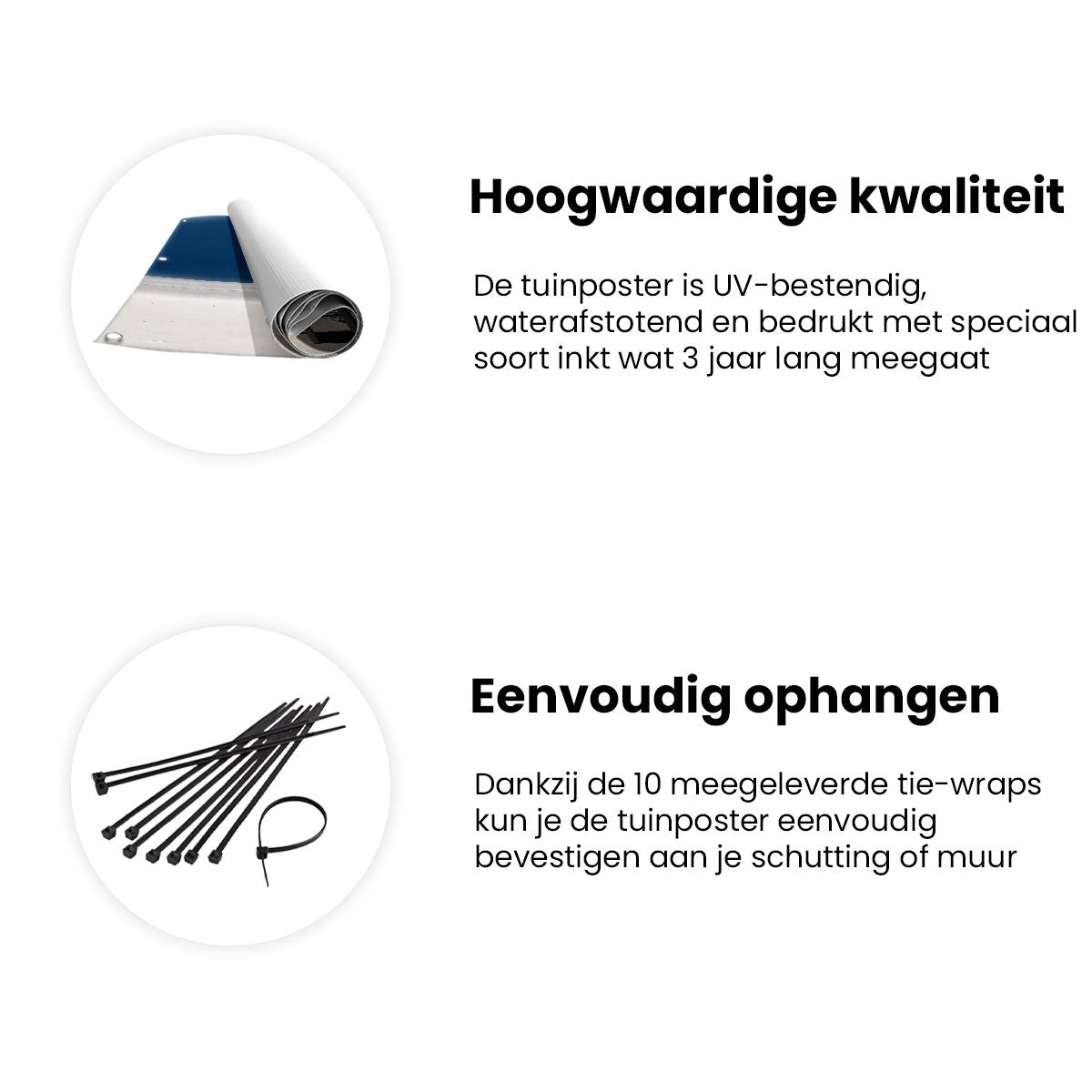 Bij aankoop ontvang je een meegeleverd ophangsysteem, zodat je op een simpele en snelle wijze de tuinposter kan ophangen.