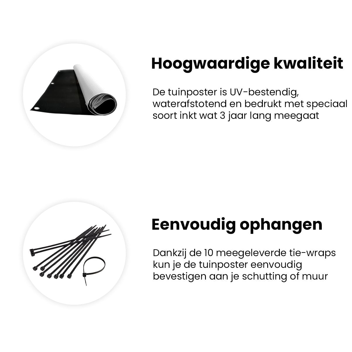 Bij aankoop ontvang je een meegeleverd ophangsysteem, zodat je op een simpele en snelle wijze de tuinposter kan ophangen.