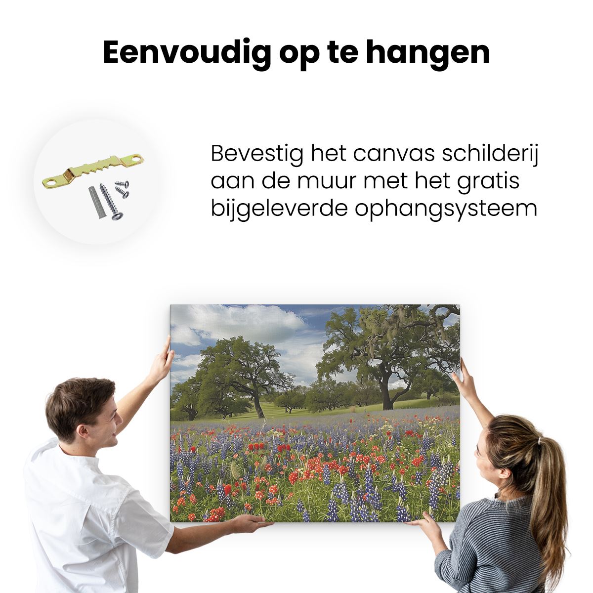 Bij aankoop ontvang je een meegeleverd ophangsysteem, zodat je op een simpele en snelle wijze het schilderij boven de bank of bed kan monteren.
