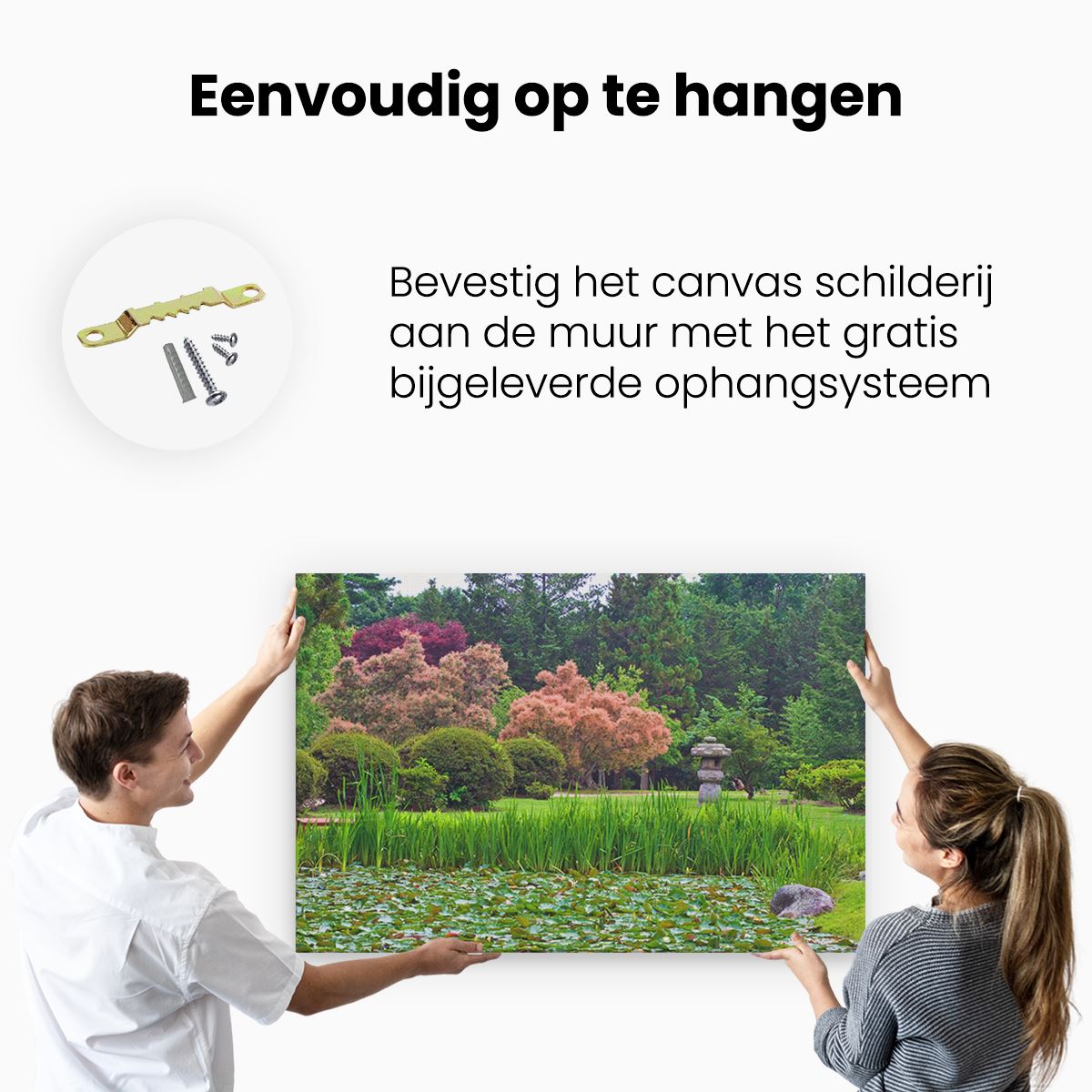 Bij aankoop ontvang je een meegeleverd ophangsysteem, zodat je op een simpele en snelle wijze het schilderij boven de bank of bed kan monteren.