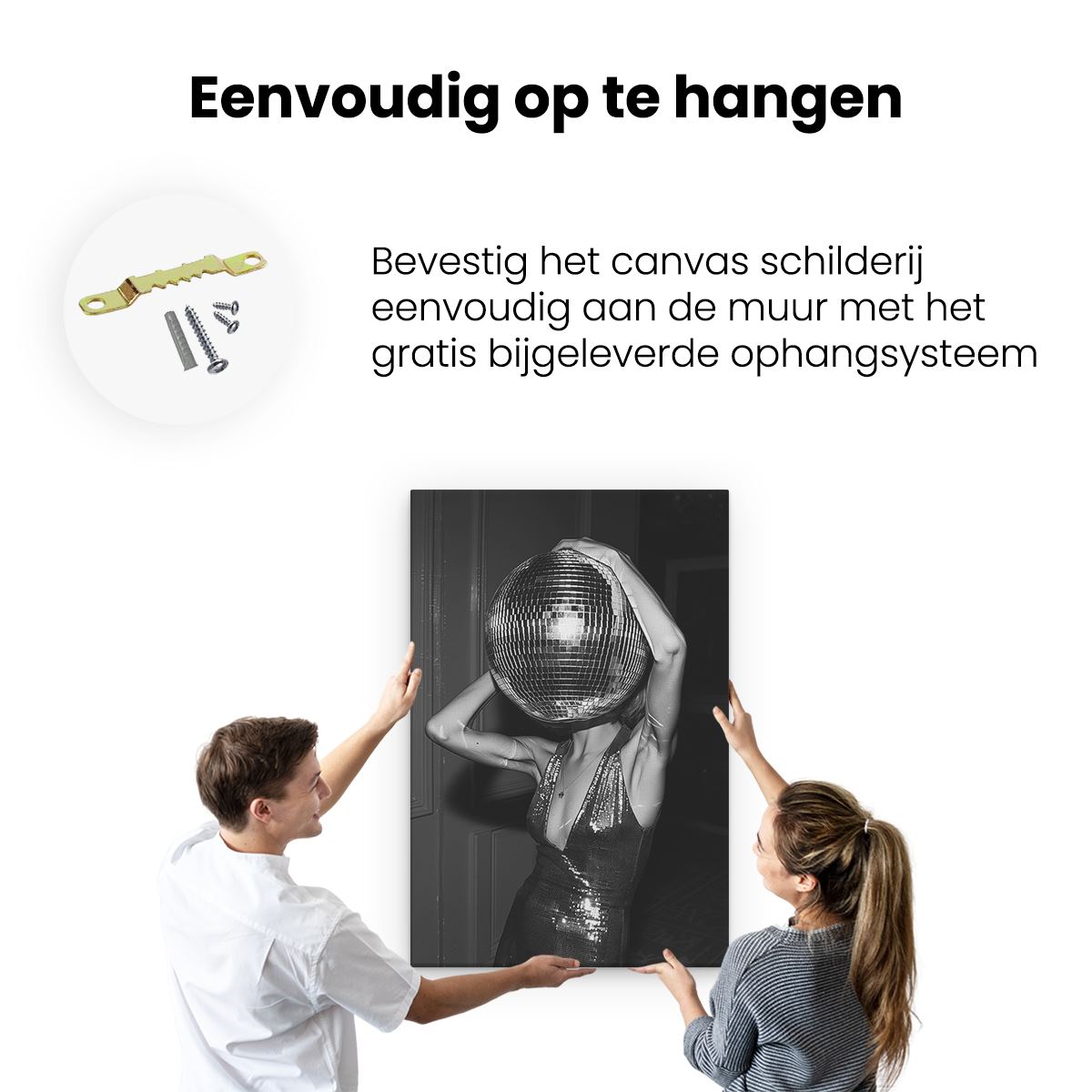 Bij aankoop ontvang je een meegeleverd ophangsysteem, zodat je op een simpele en snelle wijze het schilderij boven de bank of bed kan monteren.