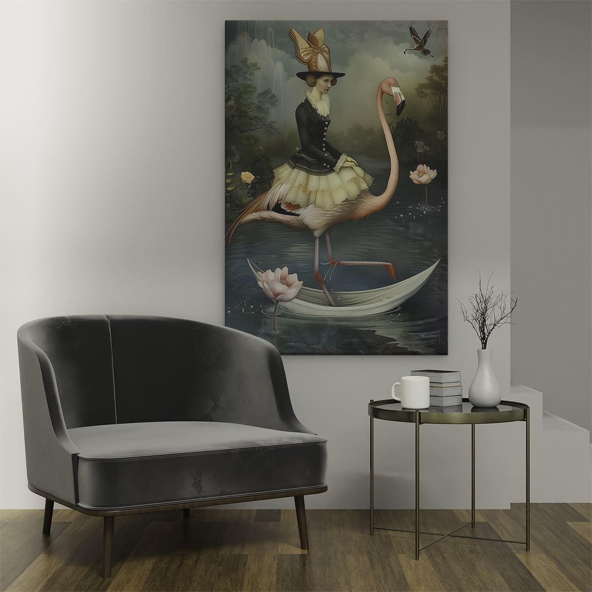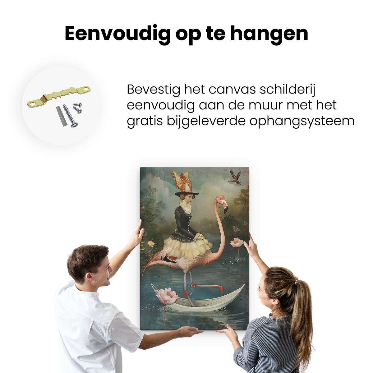 Schilderij Vrouw die een Flamingo op een Boot Berijdt
