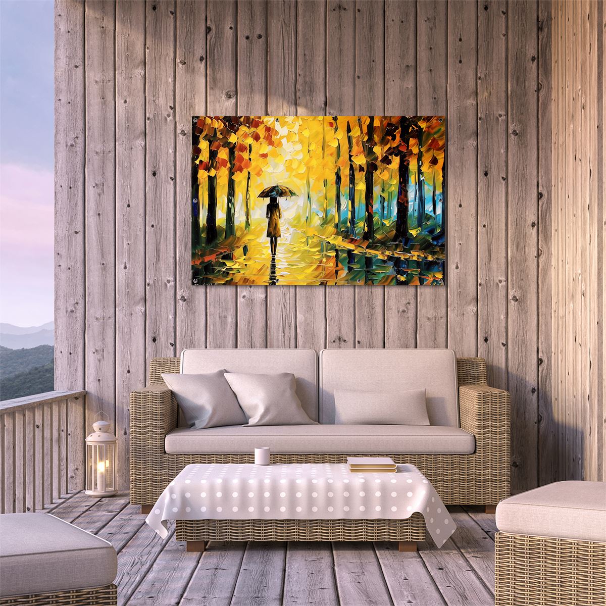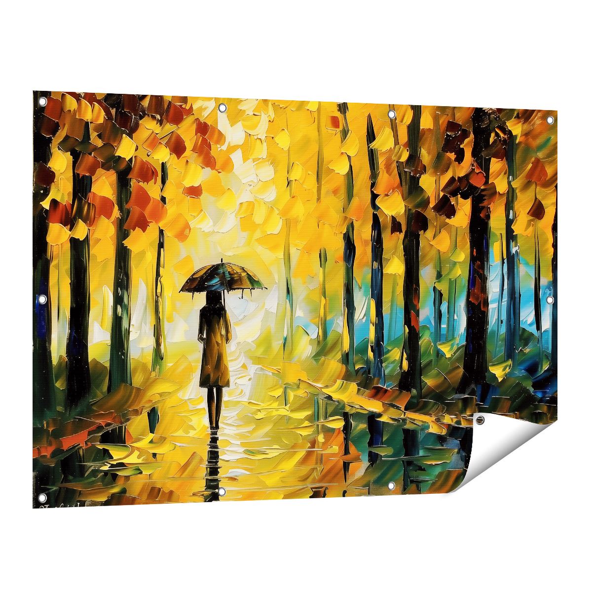 Tuinposter Vrouw die in de Regen loopt met een Paraplu