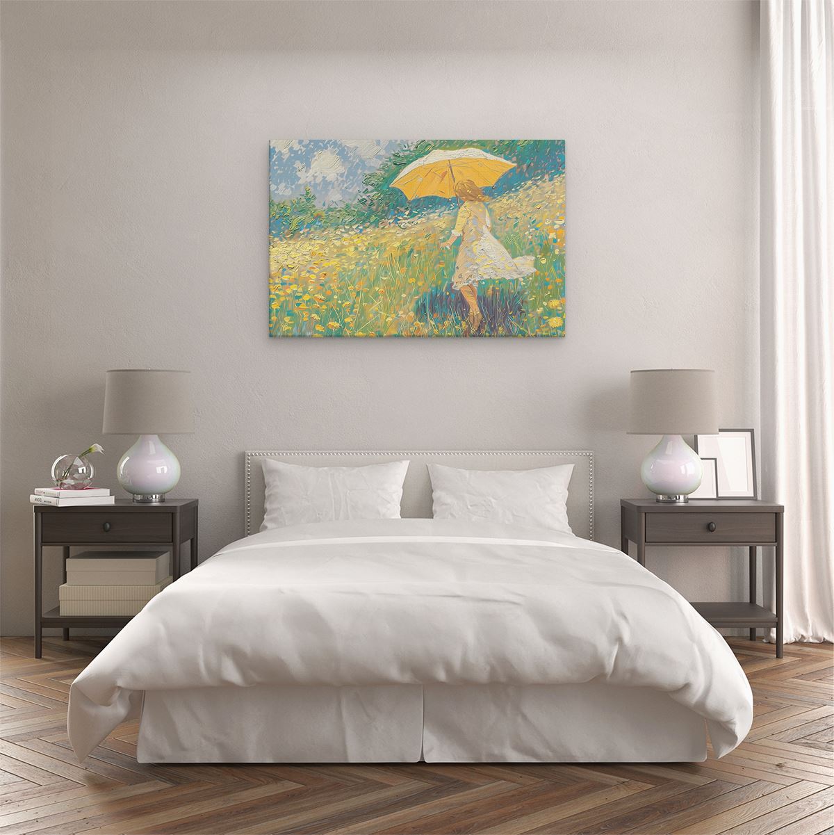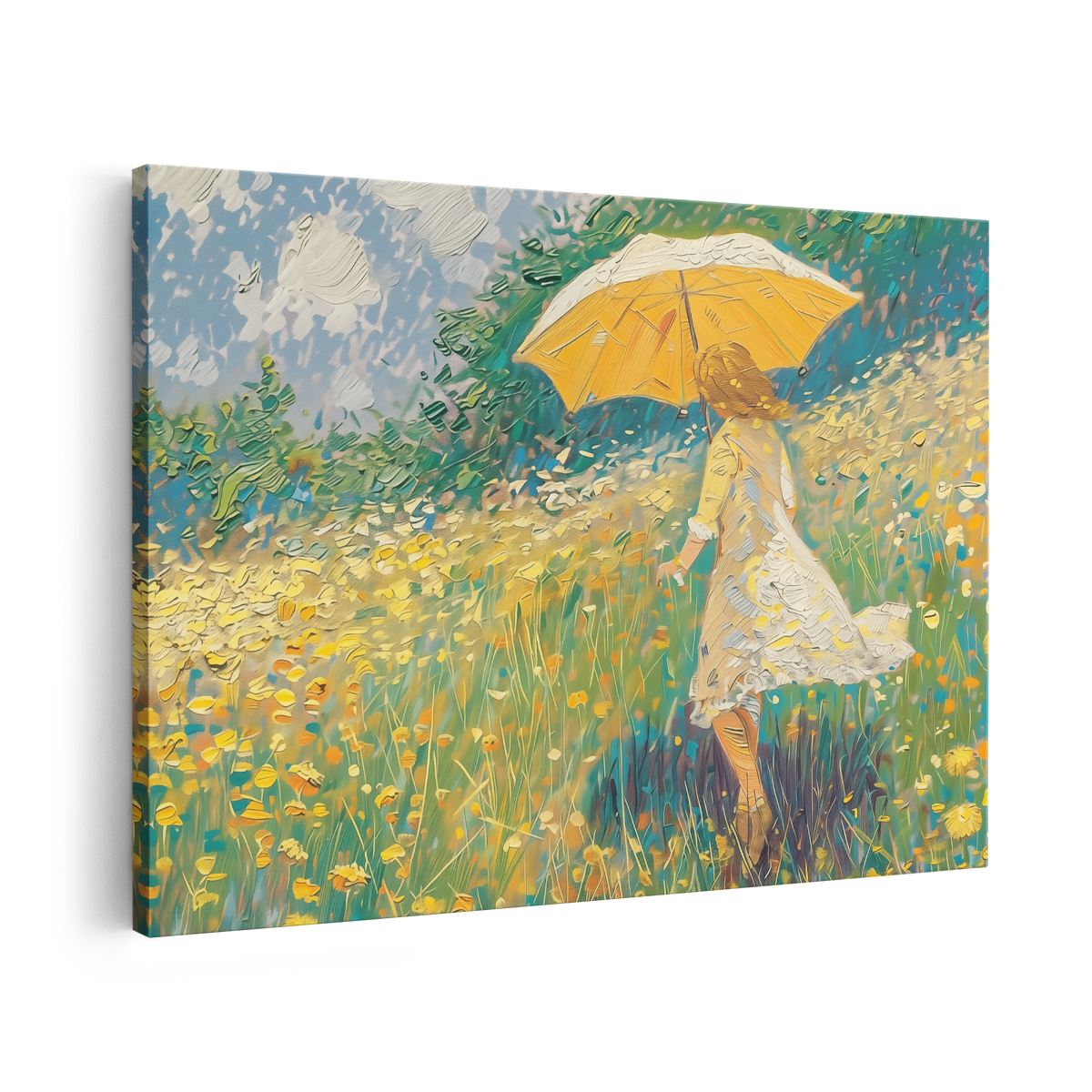 Schilderij Vrouw die met een Paraplu door een Veld met Madeliefjes loopt