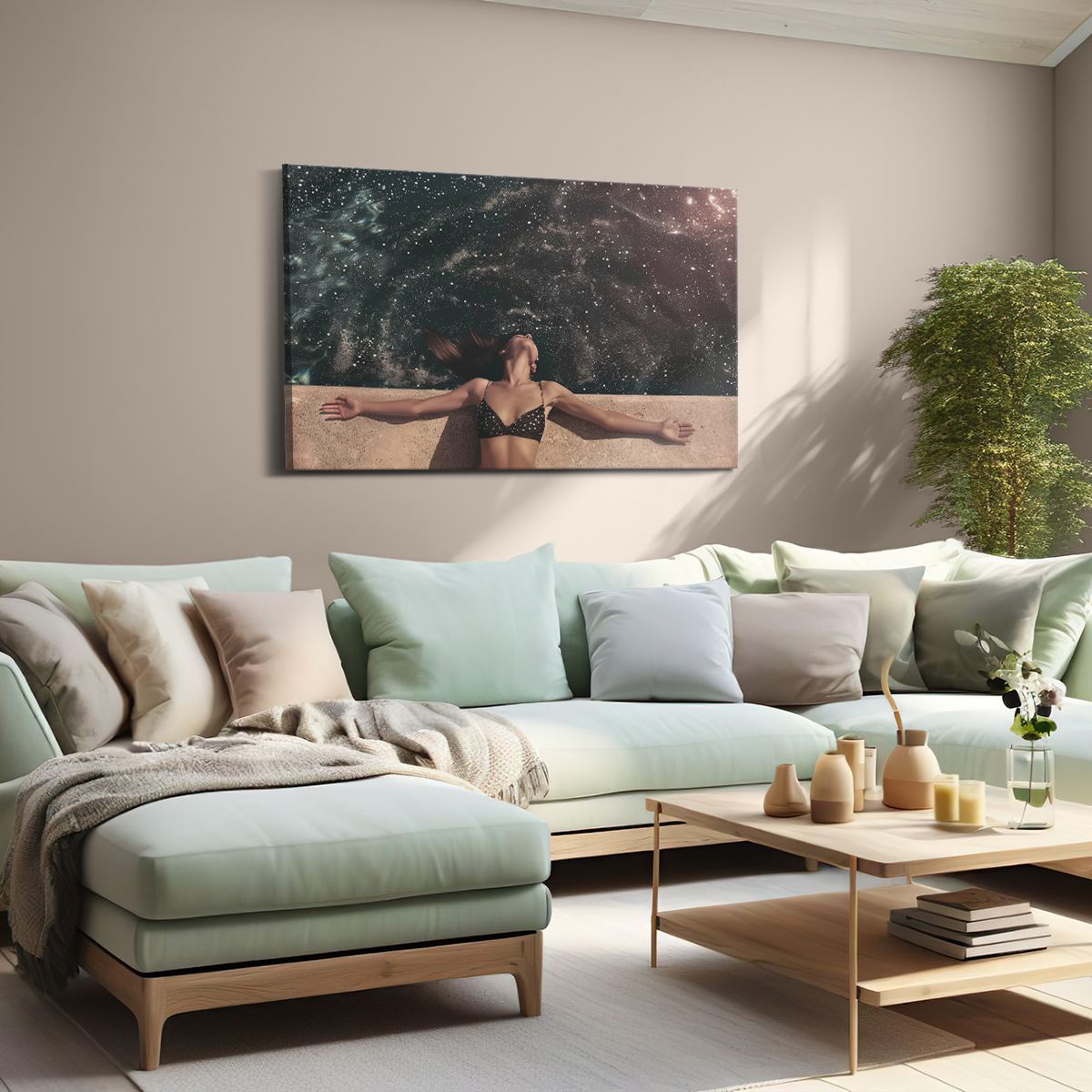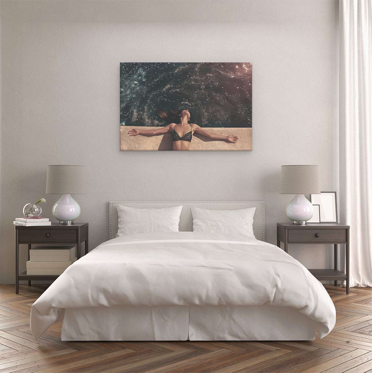 Schilderij Vrouw in een Bikini Liggend op de Rand van een Zwembad met haar Armen Uitgestrekt