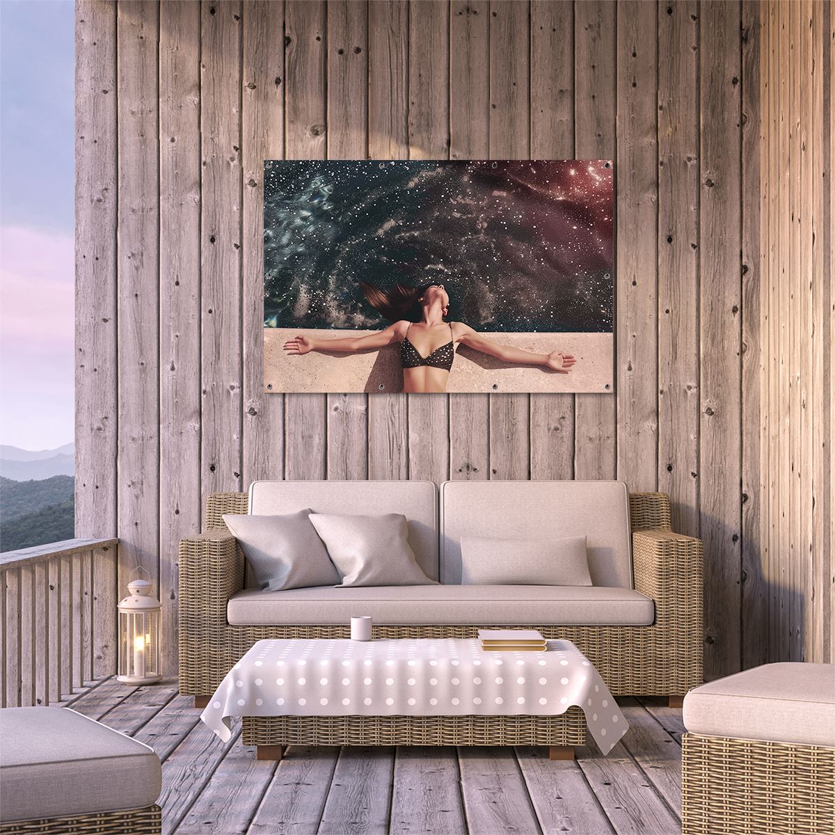 Tuinposter Vrouw in een Bikini Liggend op de Rand van een Zwembad met haar Armen Uitgestrekt