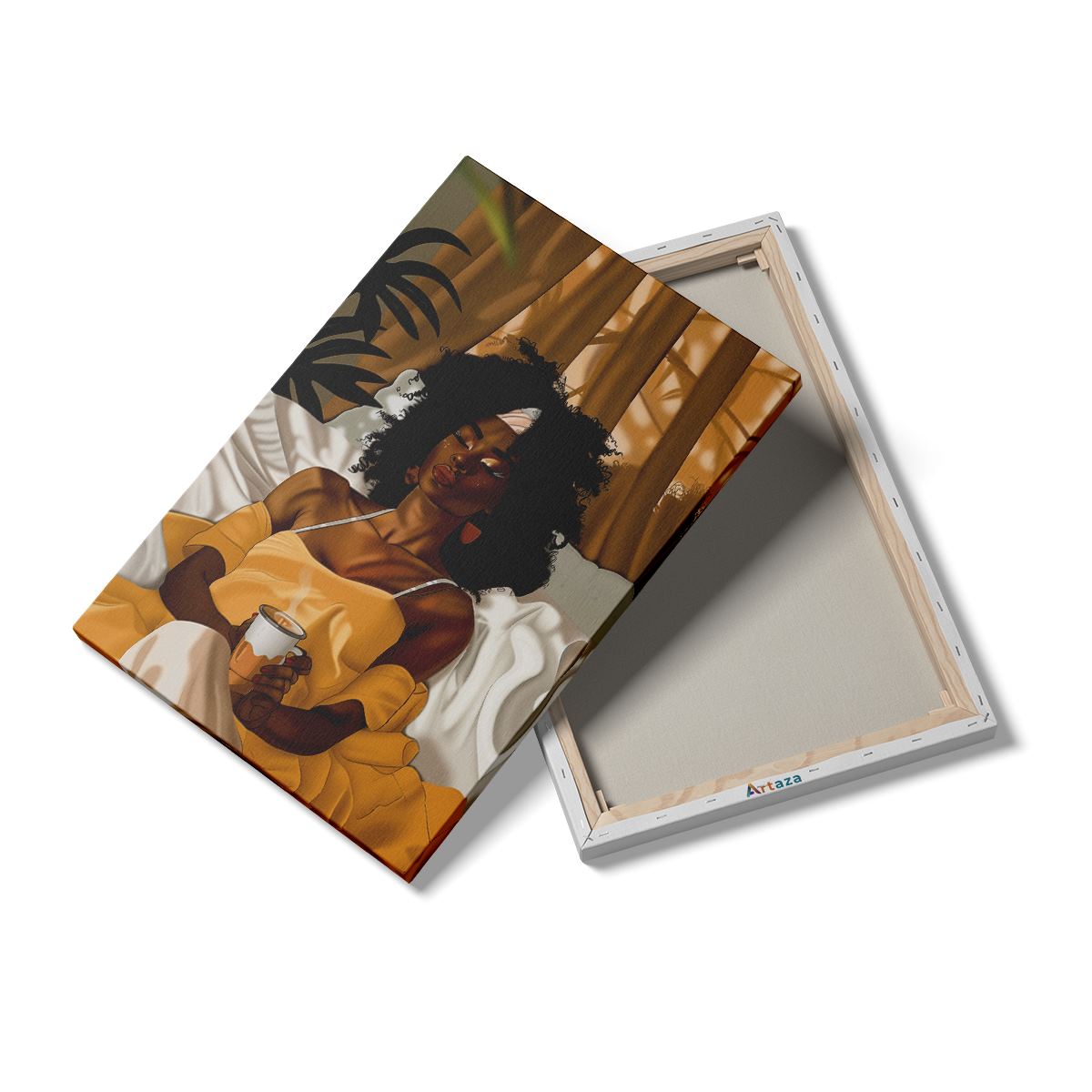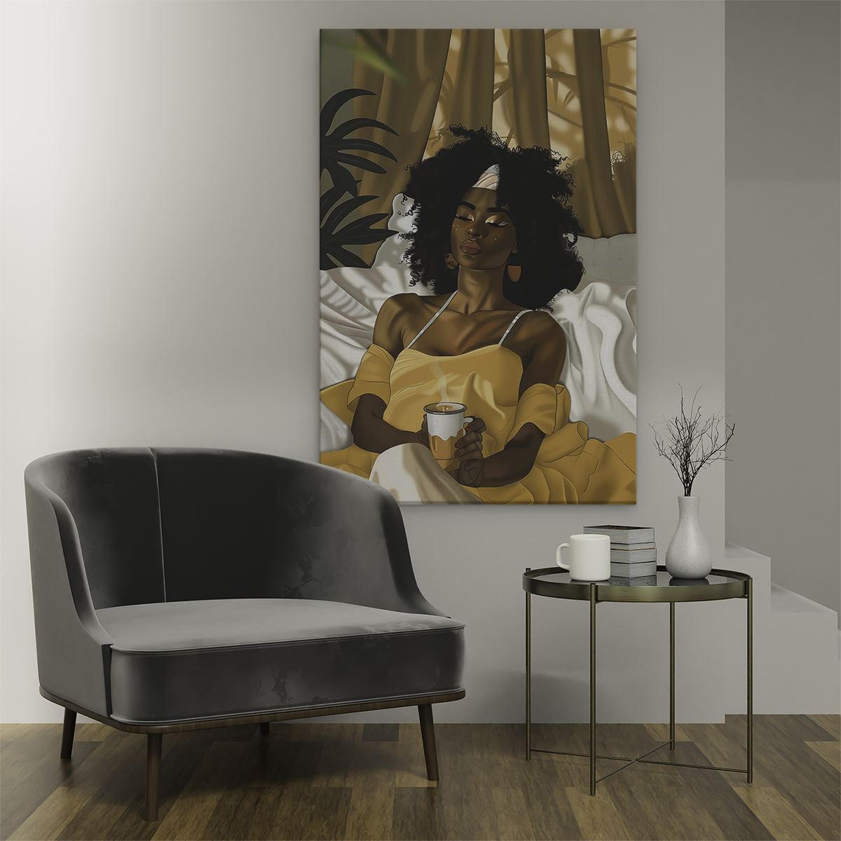 Schilderij Vrouw in een Gele Jurk Liggend in Bed met een Kopje Koffie