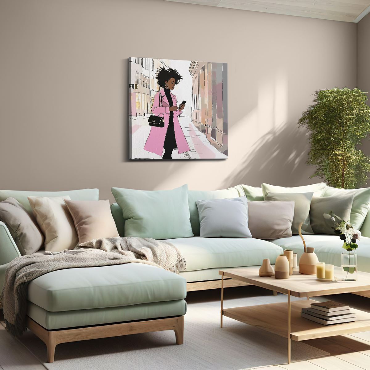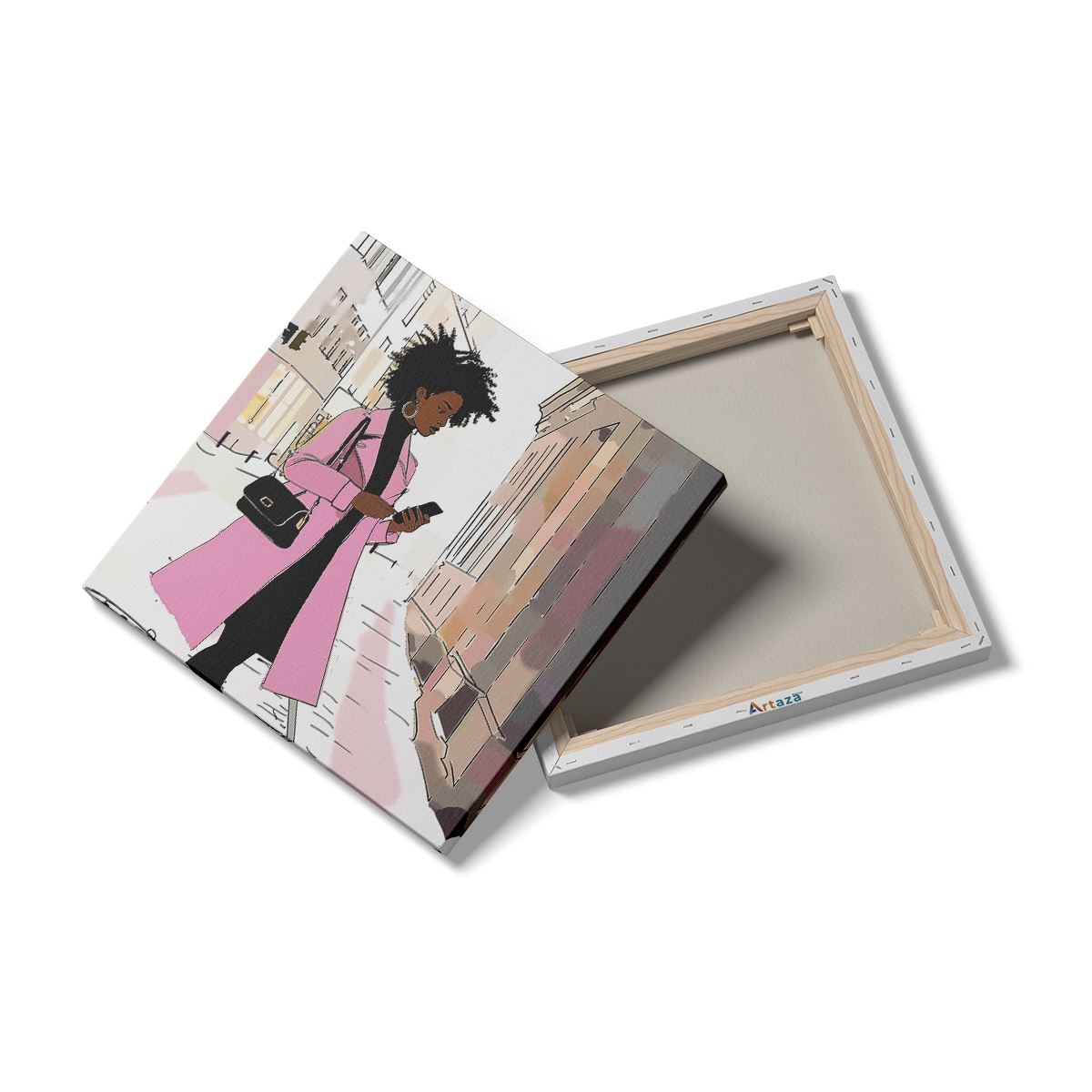 Schilderij Vrouw in een Roze Jas loopt over Straat