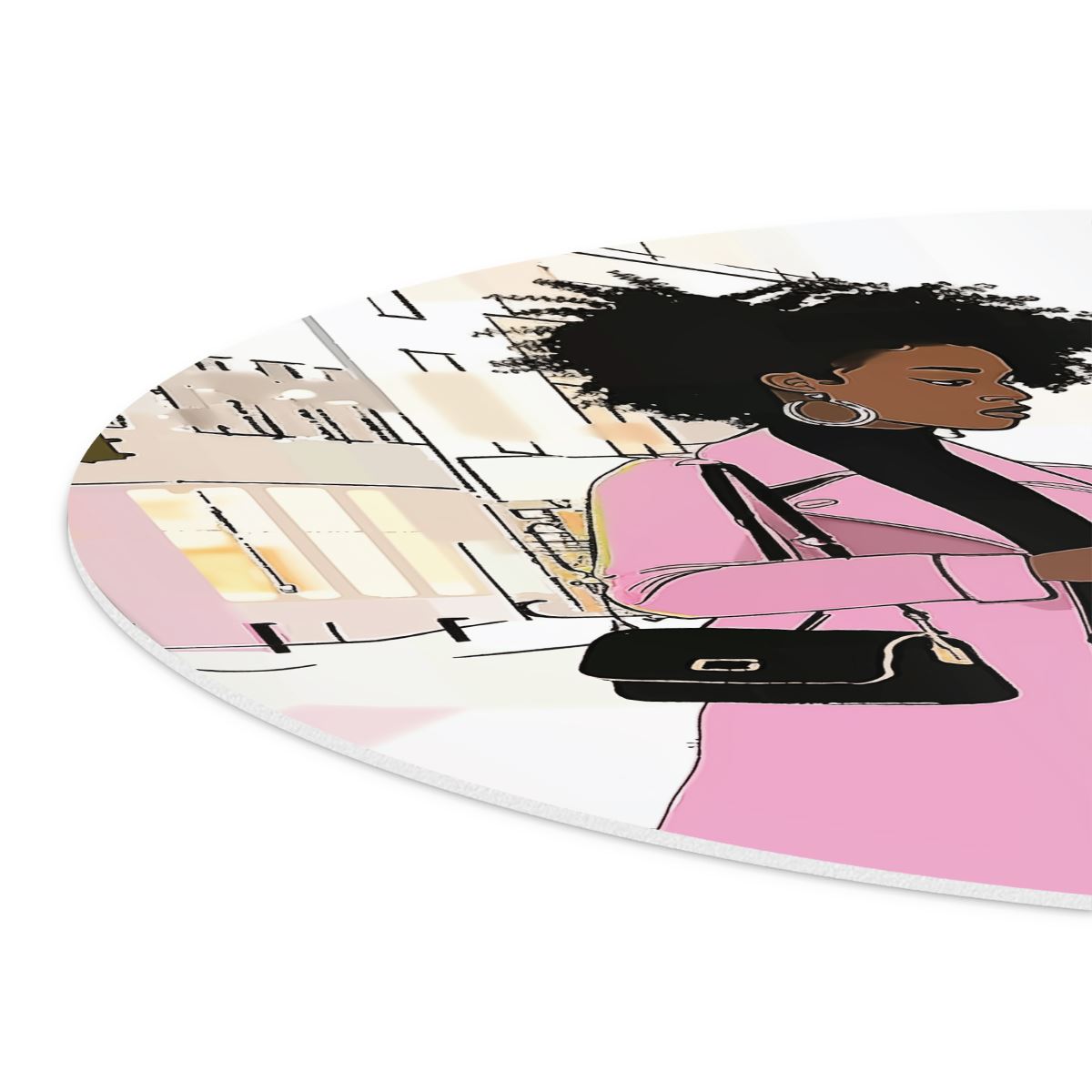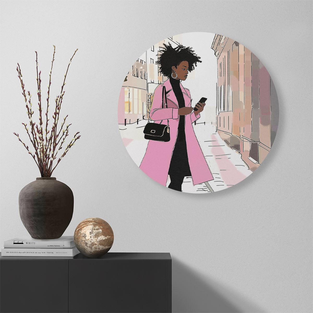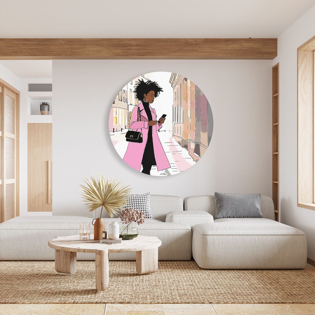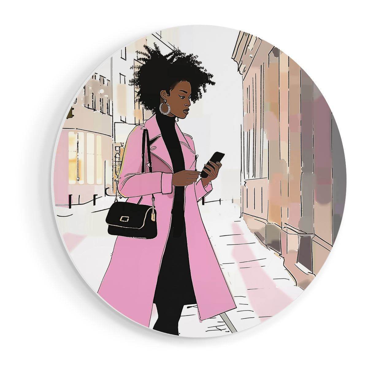 Wandcirkel Vrouw in een Roze Jas loopt over Straat