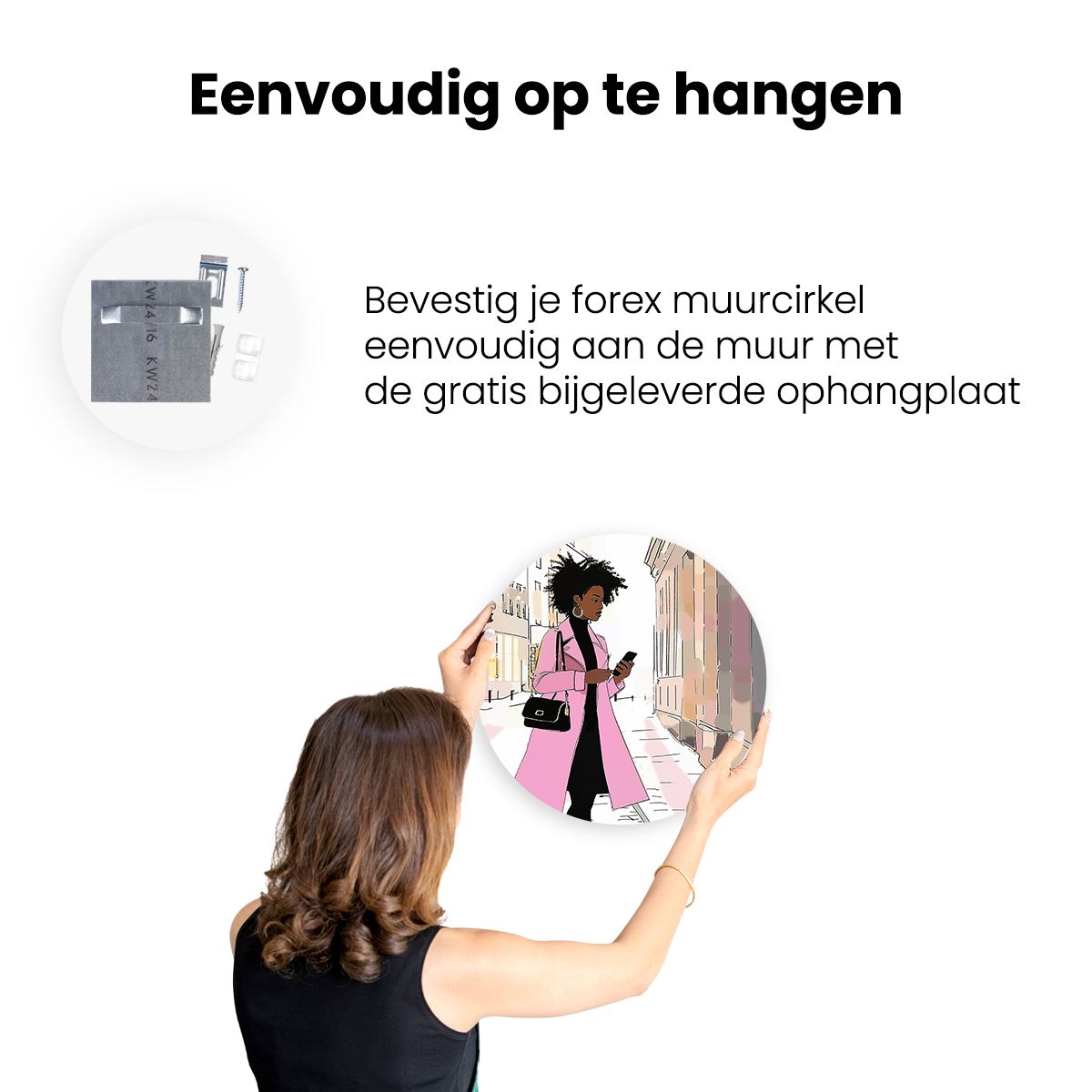 Gebruik het meegeleverde bevestigingsmateriaal om de wandcirkel aan de meeste wanden om te kunnen hangen. Een schroef en plug leveren we mee.