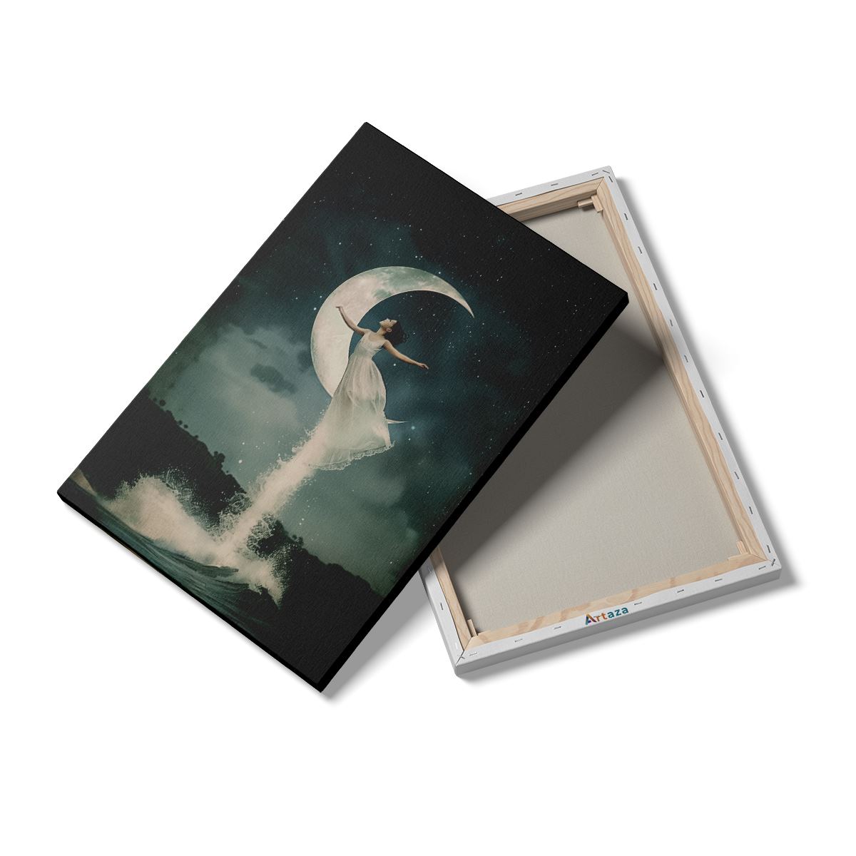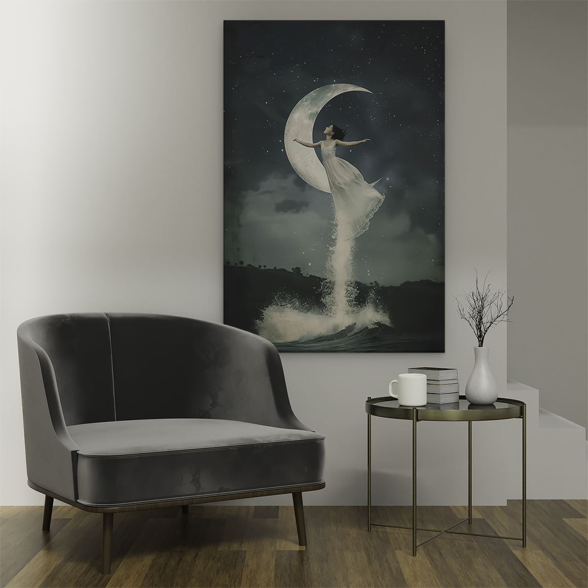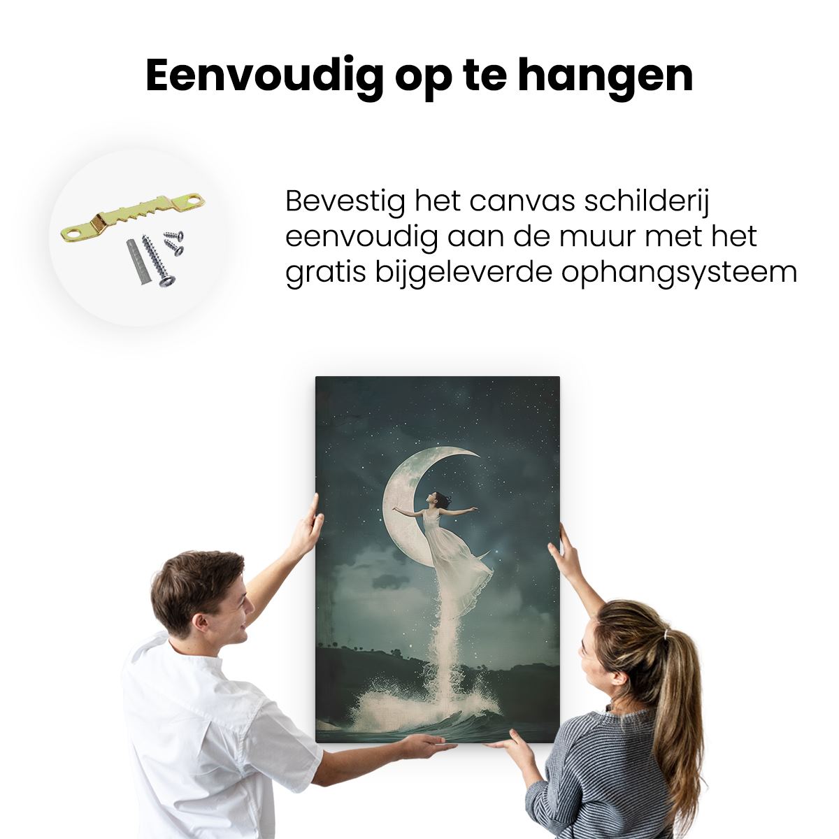 Schilderij Vrouw in een Witte Jurk die over de Maan Springt