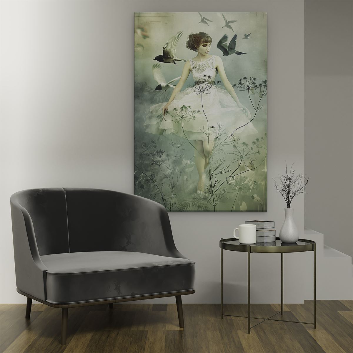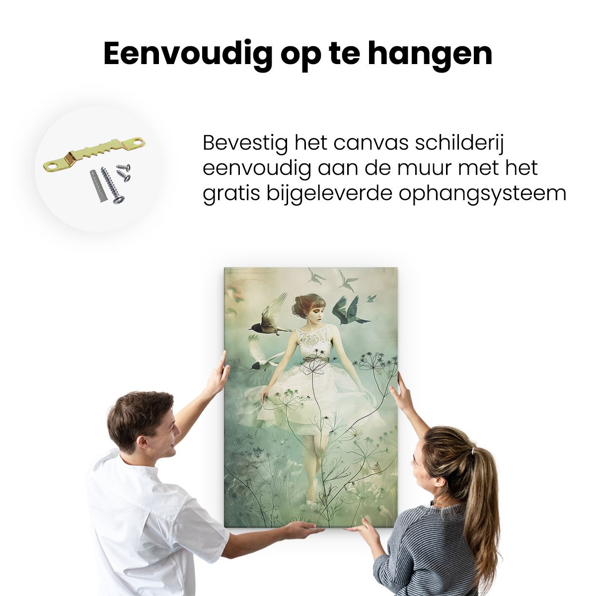 Schilderij Vrouw in een Witte Jurk met Vogels die Om haar Heen Vliegen