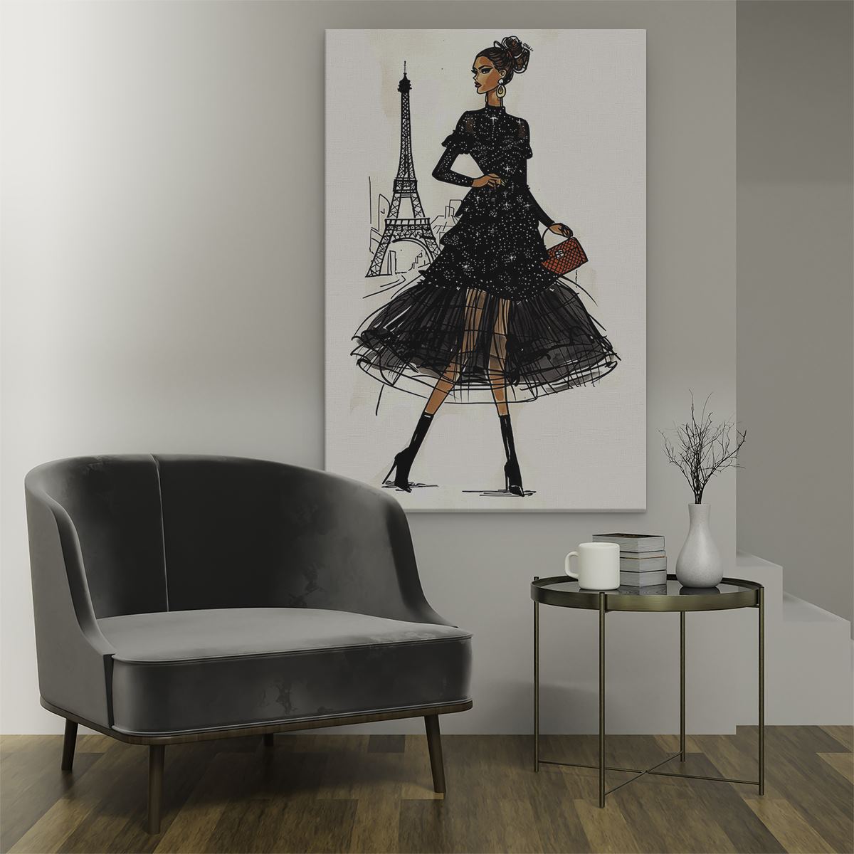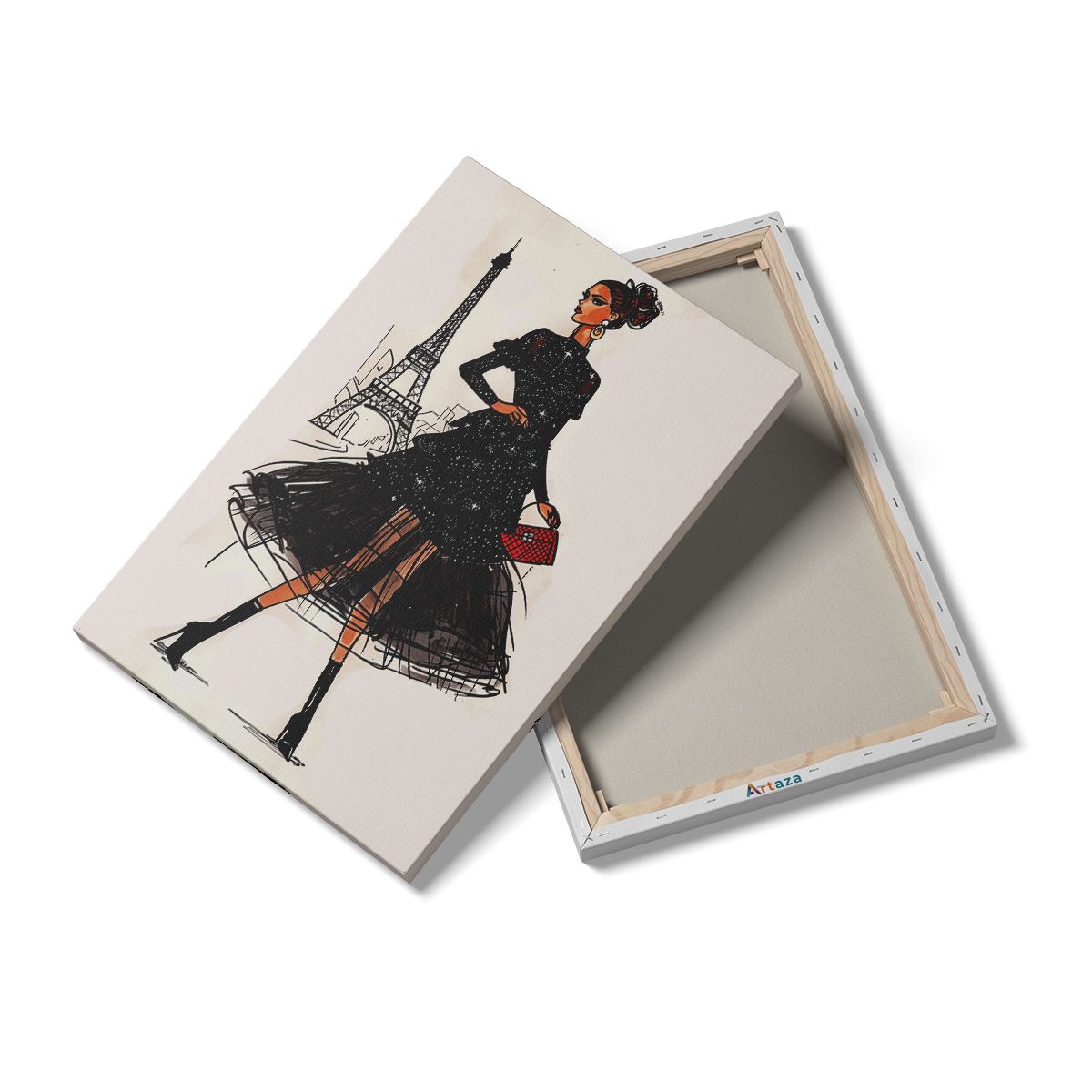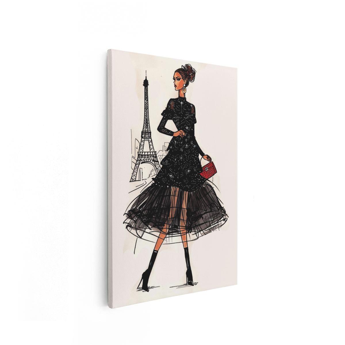 Schilderij Vrouw in een Zwarte Jurk die voor de Eiffeltoren loopt