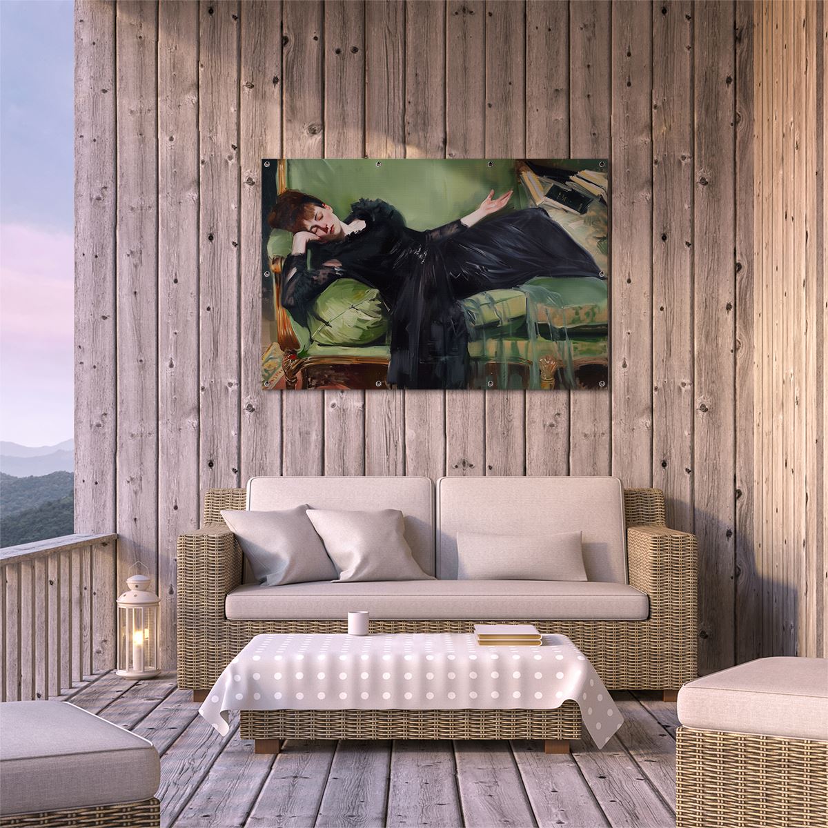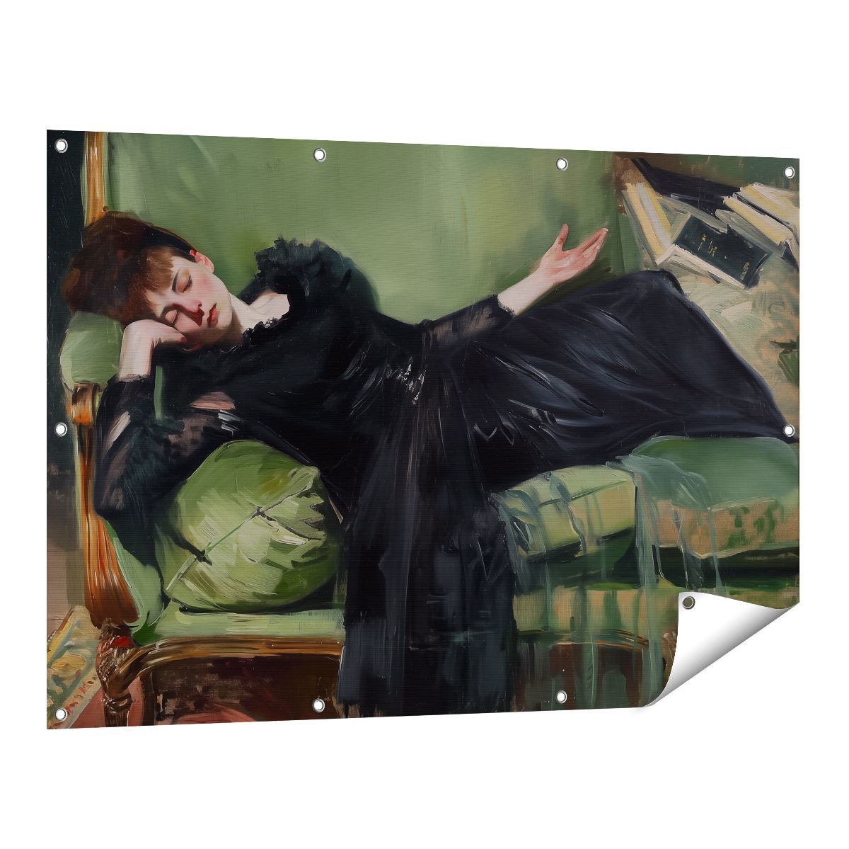 Tuinposter Vrouw in een Zwarte Jurk Liggend op een Groene Bank