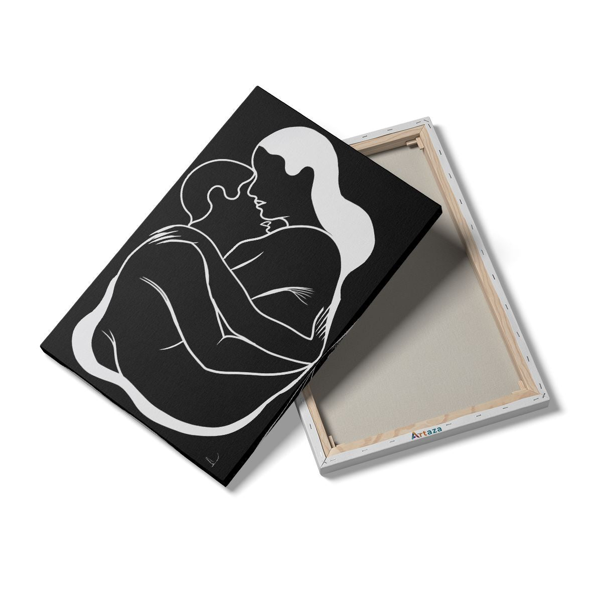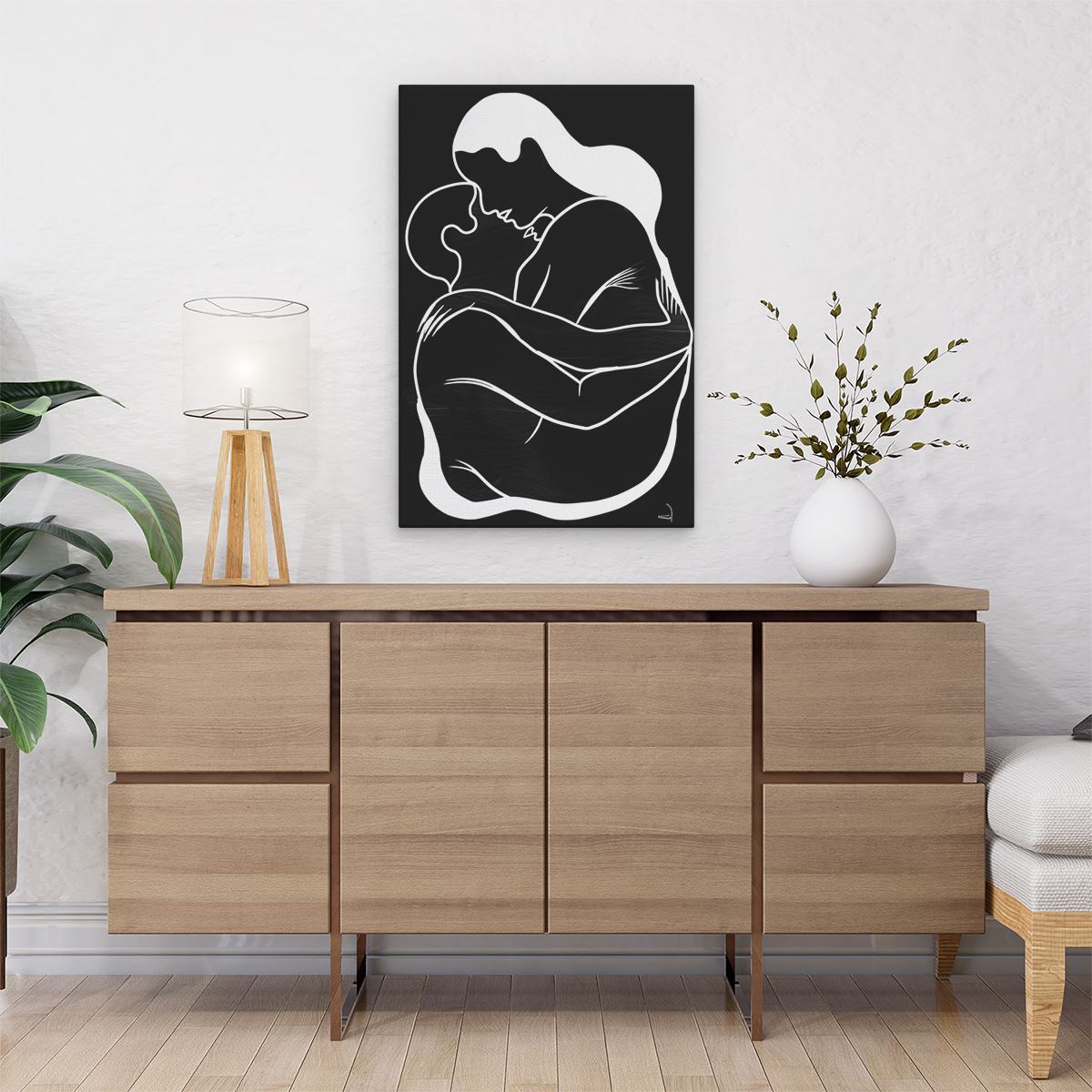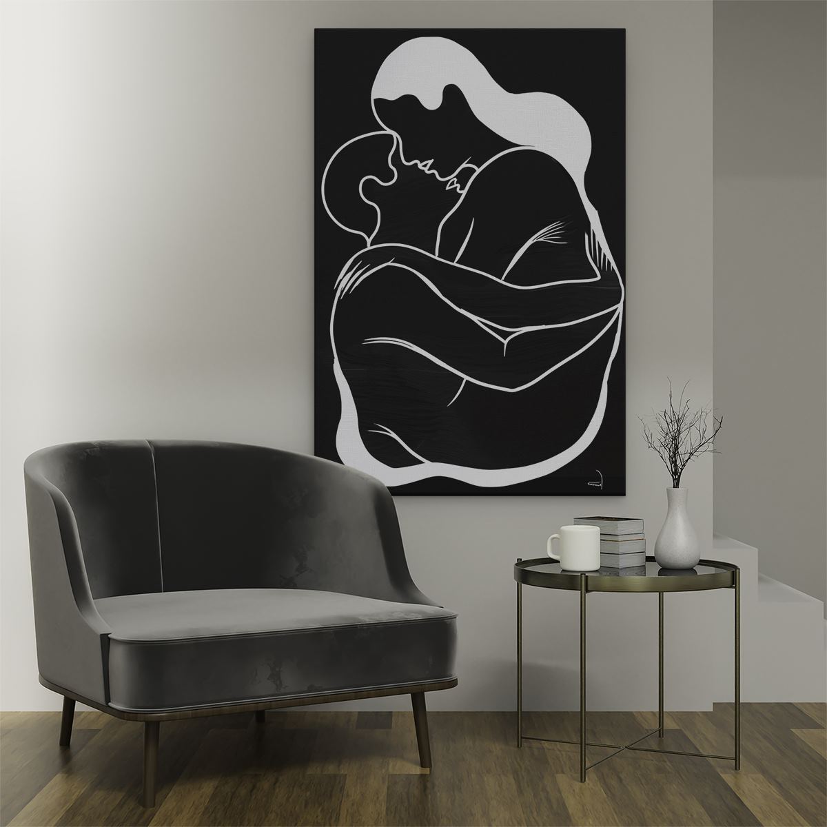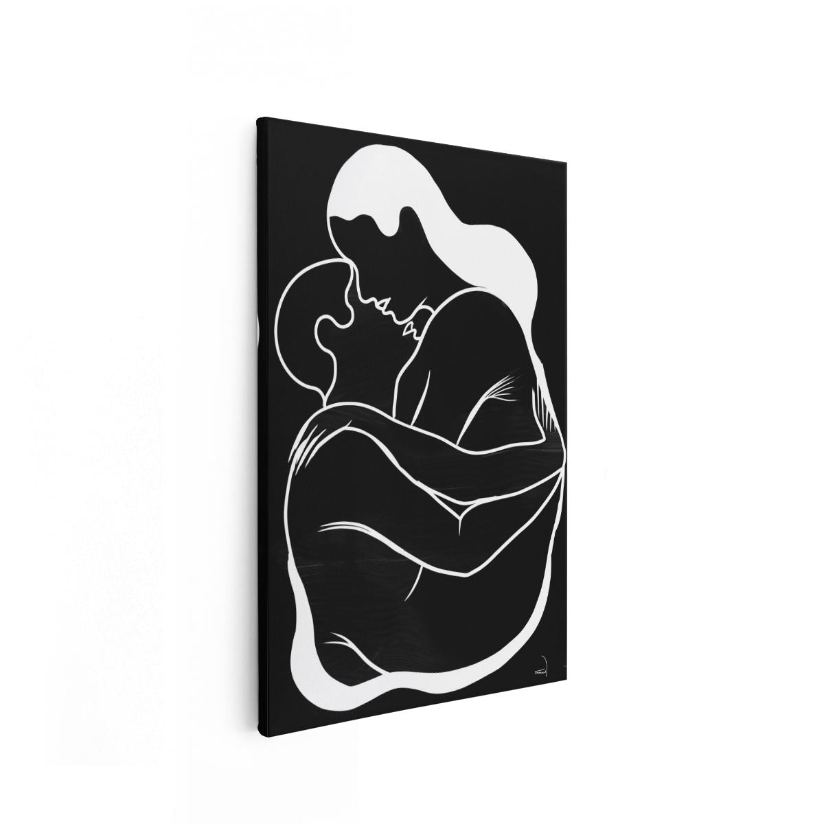 Schilderij Vrouw Knuffelt een Man in Zwart Wit