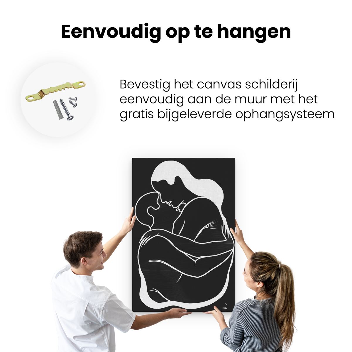 Bij aankoop ontvang je een meegeleverd ophangsysteem, zodat je op een simpele en snelle wijze het schilderij boven de bank of bed kan monteren.