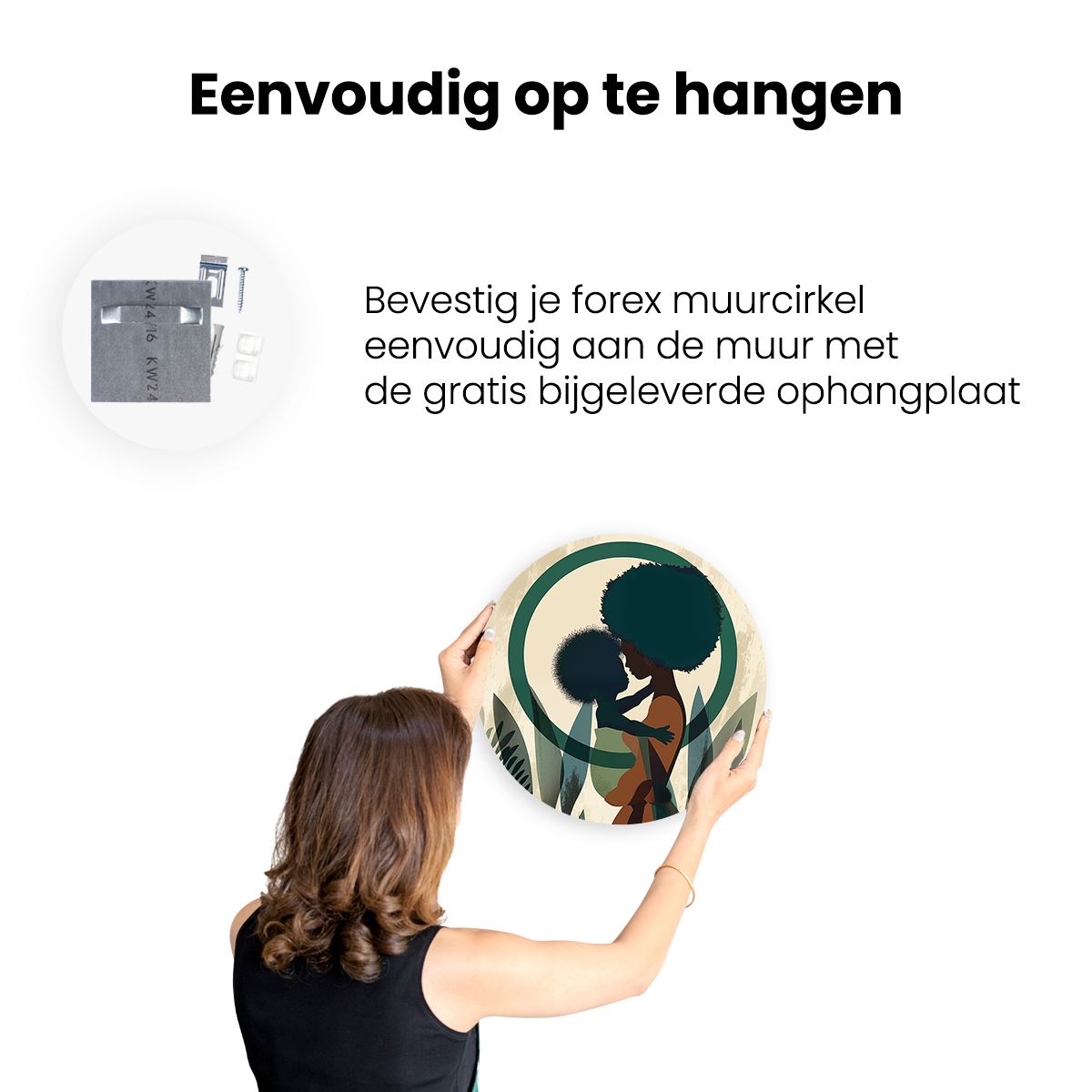 Gebruik het meegeleverde bevestigingsmateriaal om de wandcirkel aan de meeste wanden om te kunnen hangen. Een schroef en plug leveren we mee.