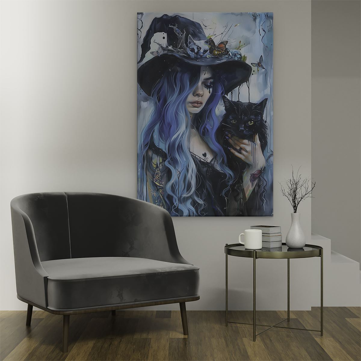 Schilderij Vrouw met Blauw haar die een Zwarte Kat Vasthoudt