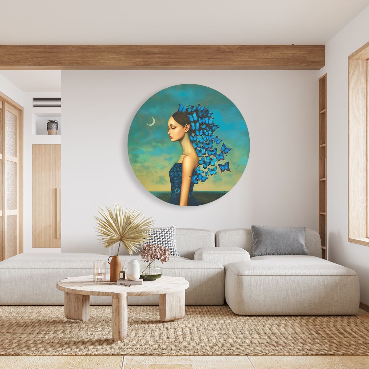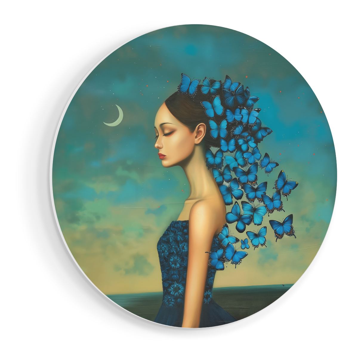 Wandcirkel Vrouw met Blauwe Vlinders op haar Hoofd