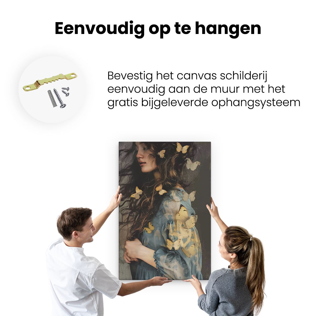 Bij aankoop ontvang je een meegeleverd ophangsysteem, zodat je op een simpele en snelle wijze het schilderij boven de bank of bed kan monteren.