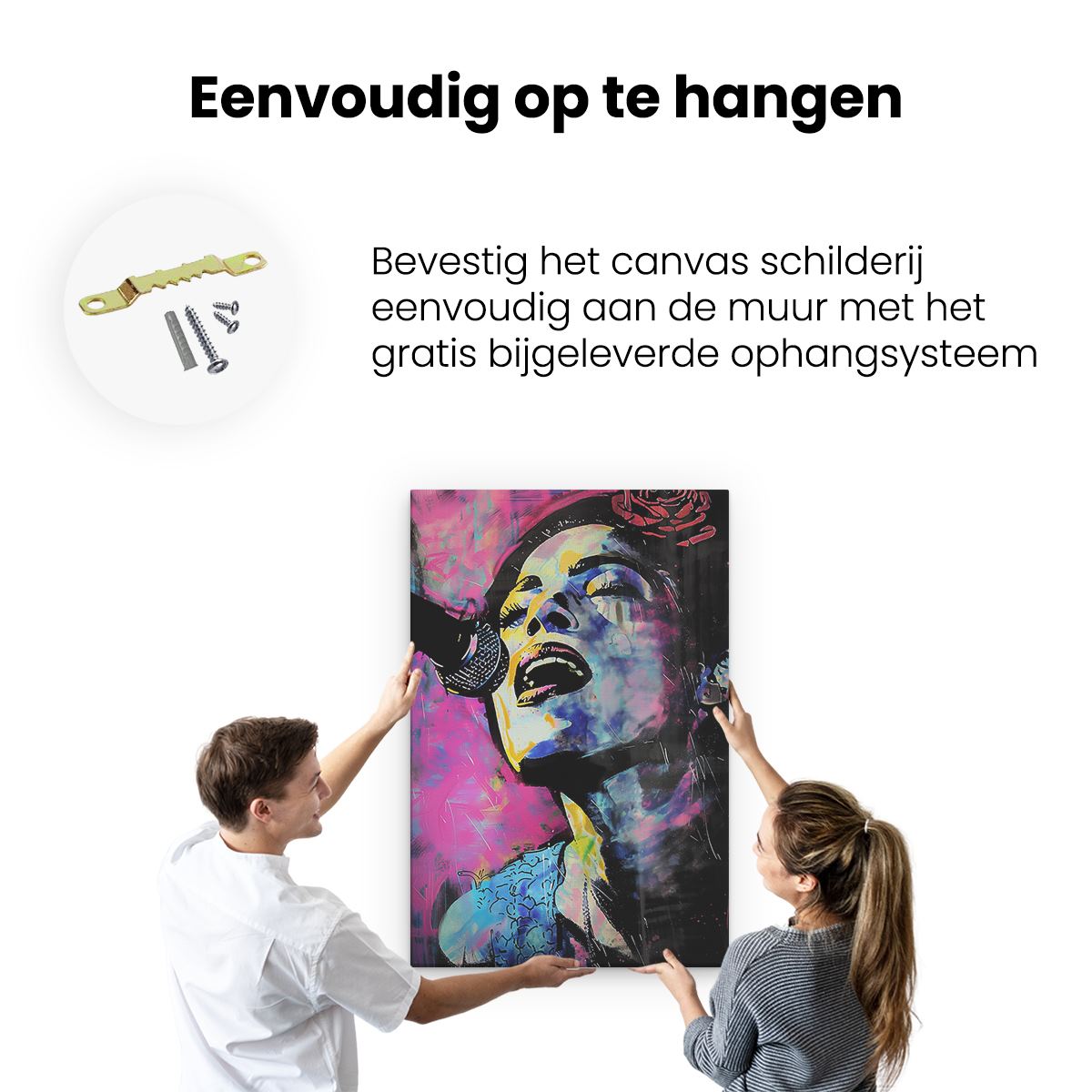 Bij aankoop ontvang je een meegeleverd ophangsysteem, zodat je op een simpele en snelle wijze het schilderij boven de bank of bed kan monteren.
