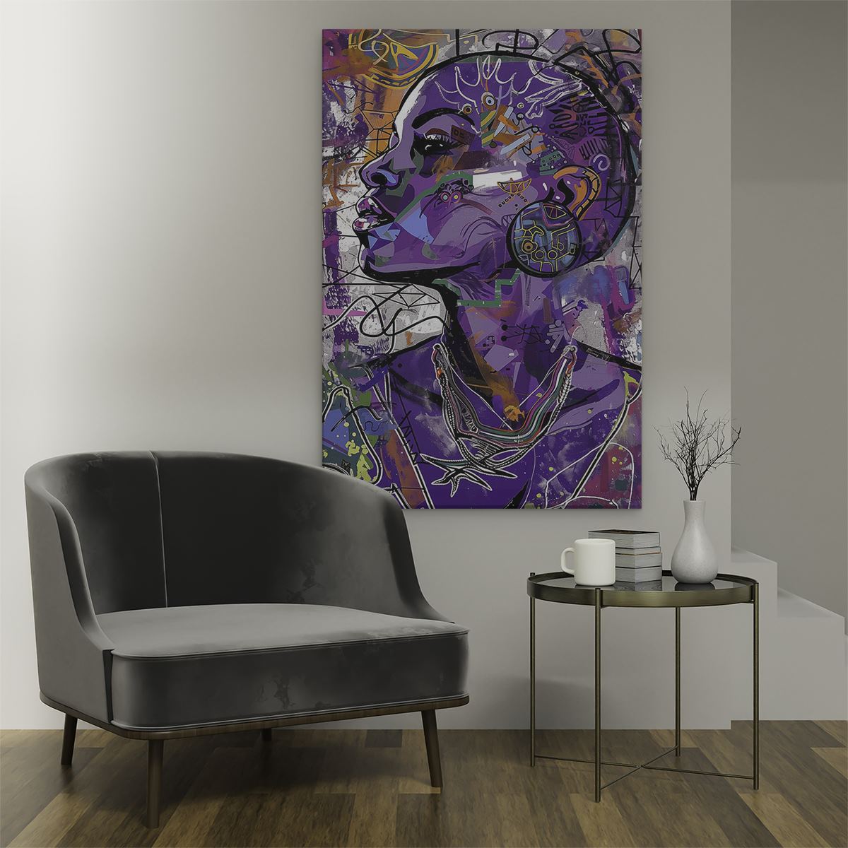 Schilderij Vrouwengezicht in Paars met een Kleurrijke Achtergrond