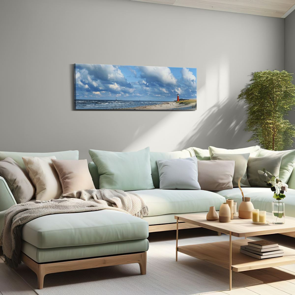 Schilderij Vuurtoren op een Strand onder een Bewolkte Hemel