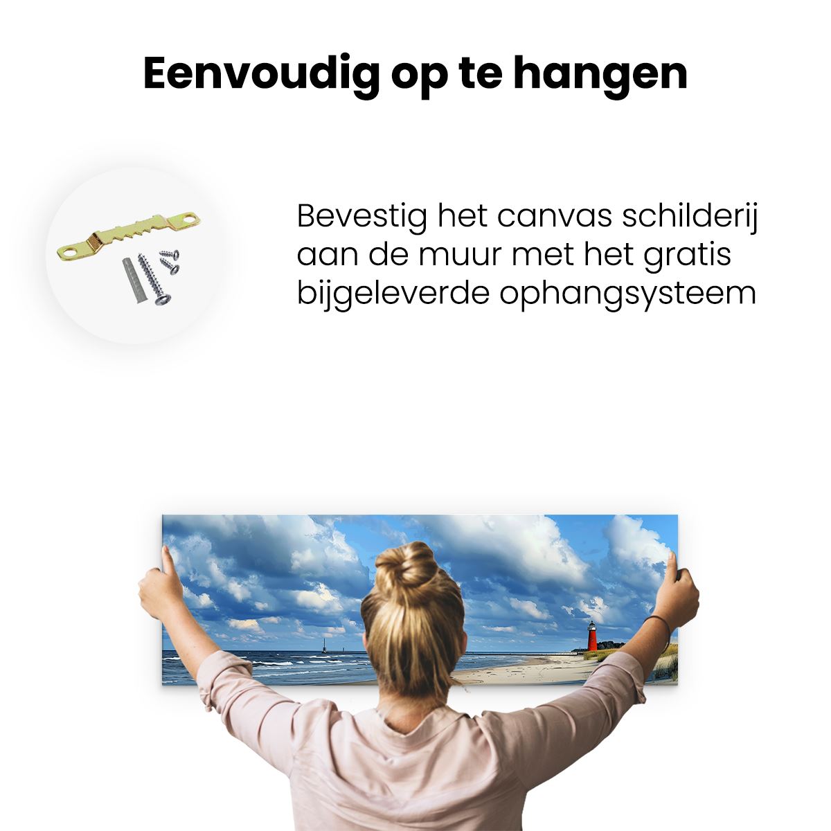 Bij aankoop ontvang je een meegeleverd ophangsysteem, zodat je op een simpele en snelle wijze het schilderij boven de bank of bed kan monteren.