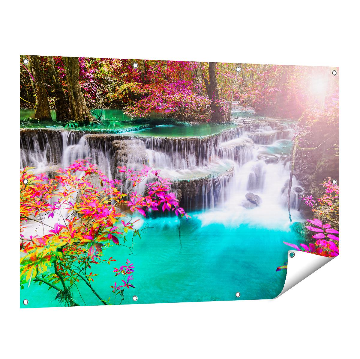 Tuinposter Waterval In De Herfst Met Kleurrijke Bloemen
