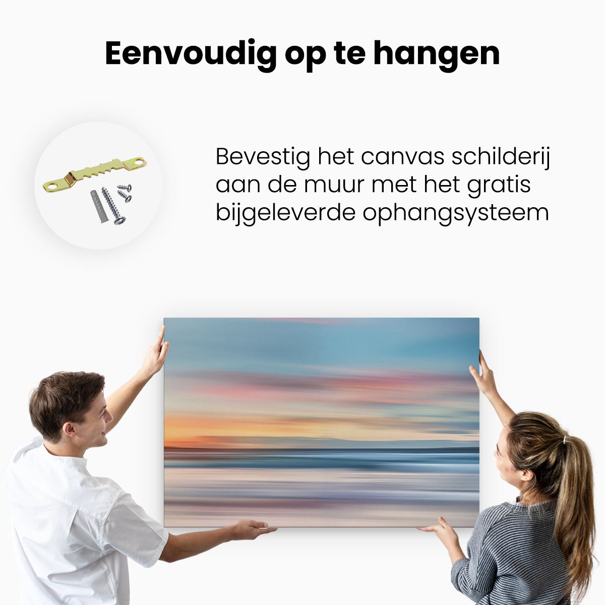 Bij aankoop ontvang je een meegeleverd ophangsysteem, zodat je op een simpele en snelle wijze het schilderij boven de bank of bed kan monteren.