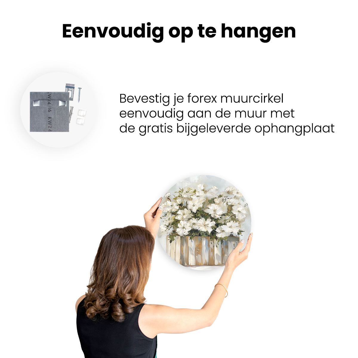 Gebruik het meegeleverde bevestigingsmateriaal om de wandcirkel aan de meeste wanden om te kunnen hangen. Een schroef en plug leveren we mee.