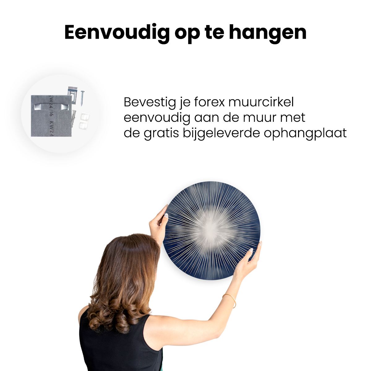 Je kunt het beste de cirkel plat op de vloer leggen en vanuit daar bepalen wat recht is. Op het hoogste punt plak je verticaal een plakbandje, en dit laat je dan een stukje over de achterkant heen lopen. Dan draai je de wandcirkel om en plak je de ophangplaat op ¼ deel van de bovenkant, recht onder het plakbandje.