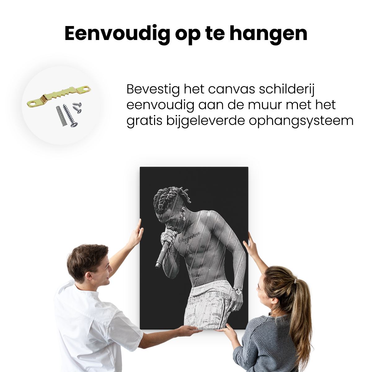 Bij aankoop ontvang je een meegeleverd ophangsysteem, zodat je op een simpele en snelle wijze het schilderij boven de bank of bed kan monteren.