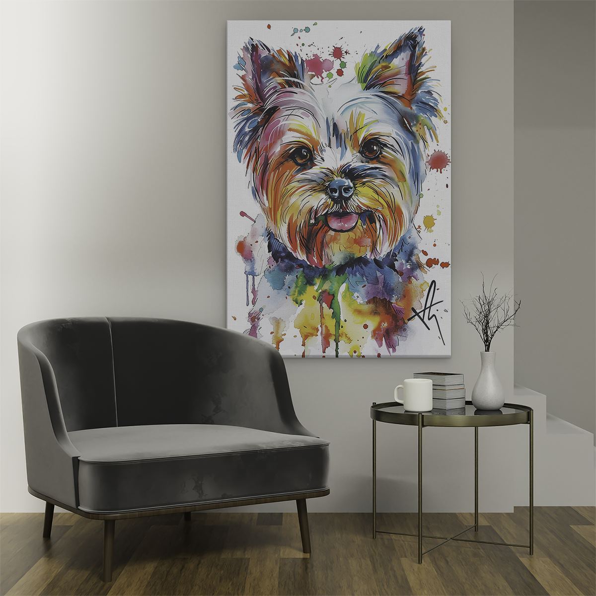 Schilderij Yorkshire Terrier met Kleurrijke Verfspatten