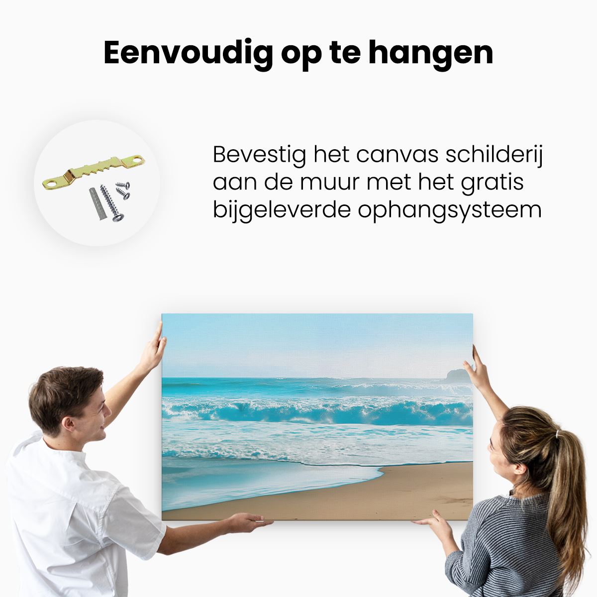 Bij aankoop ontvang je een meegeleverd ophangsysteem, zodat je op een simpele en snelle wijze het schilderij boven de bank of bed kan monteren.