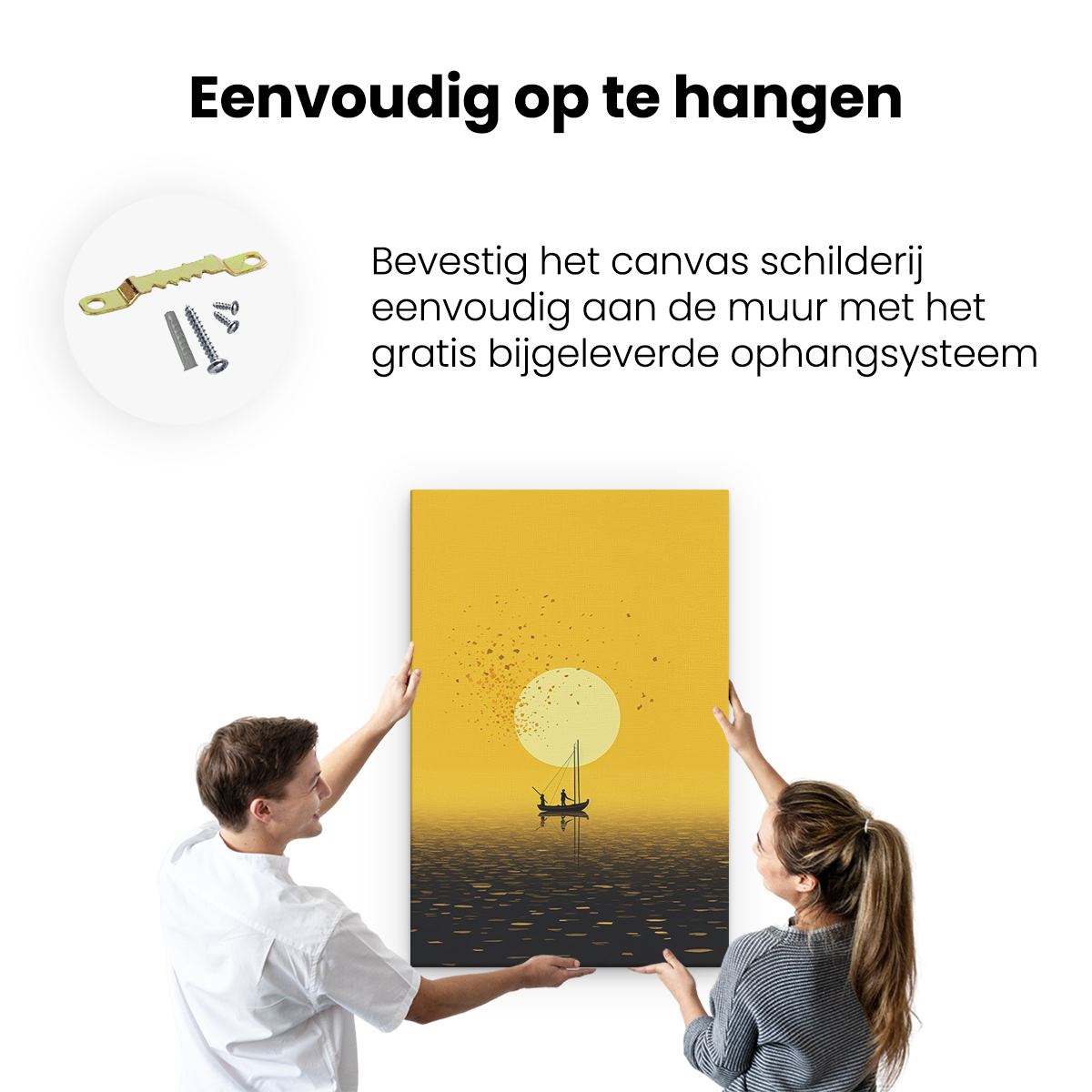 Bij aankoop ontvang je een meegeleverd ophangsysteem, zodat je op een simpele en snelle wijze het schilderij boven de bank of bed kan monteren.