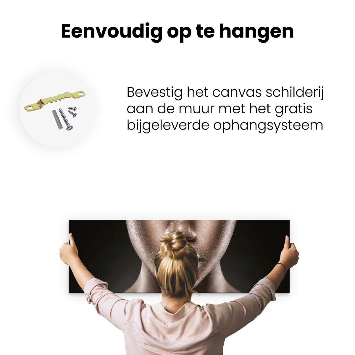 Bij aankoop ontvang je een meegeleverd ophangsysteem, zodat je op een simpele en snelle wijze het schilderij boven de bank of bed kan monteren.