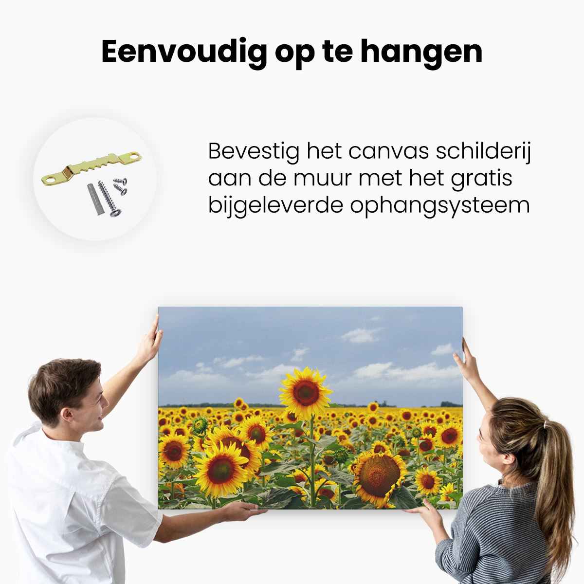 Bij aankoop ontvang je een meegeleverd ophangsysteem, zodat je op een simpele en snelle wijze het schilderij boven de bank of bed kan monteren.