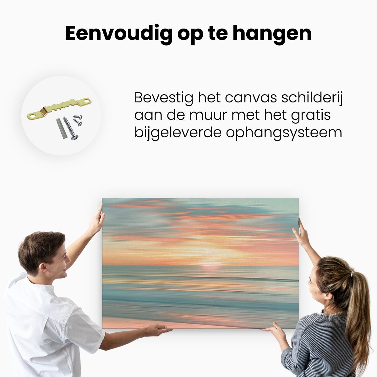 Bij aankoop ontvang je een meegeleverd ophangsysteem, zodat je op een simpele en snelle wijze het schilderij boven de bank of bed kan monteren.