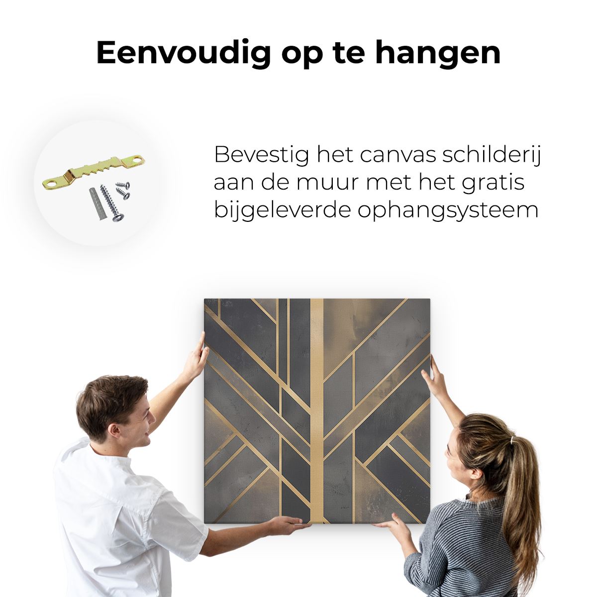 Bij aankoop ontvang je een meegeleverd ophangsysteem, zodat je op een simpele en snelle wijze het schilderij boven de bank of bed kan monteren.