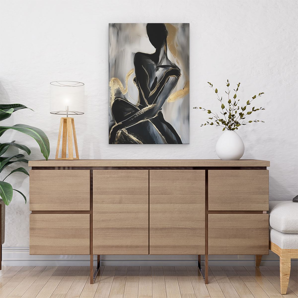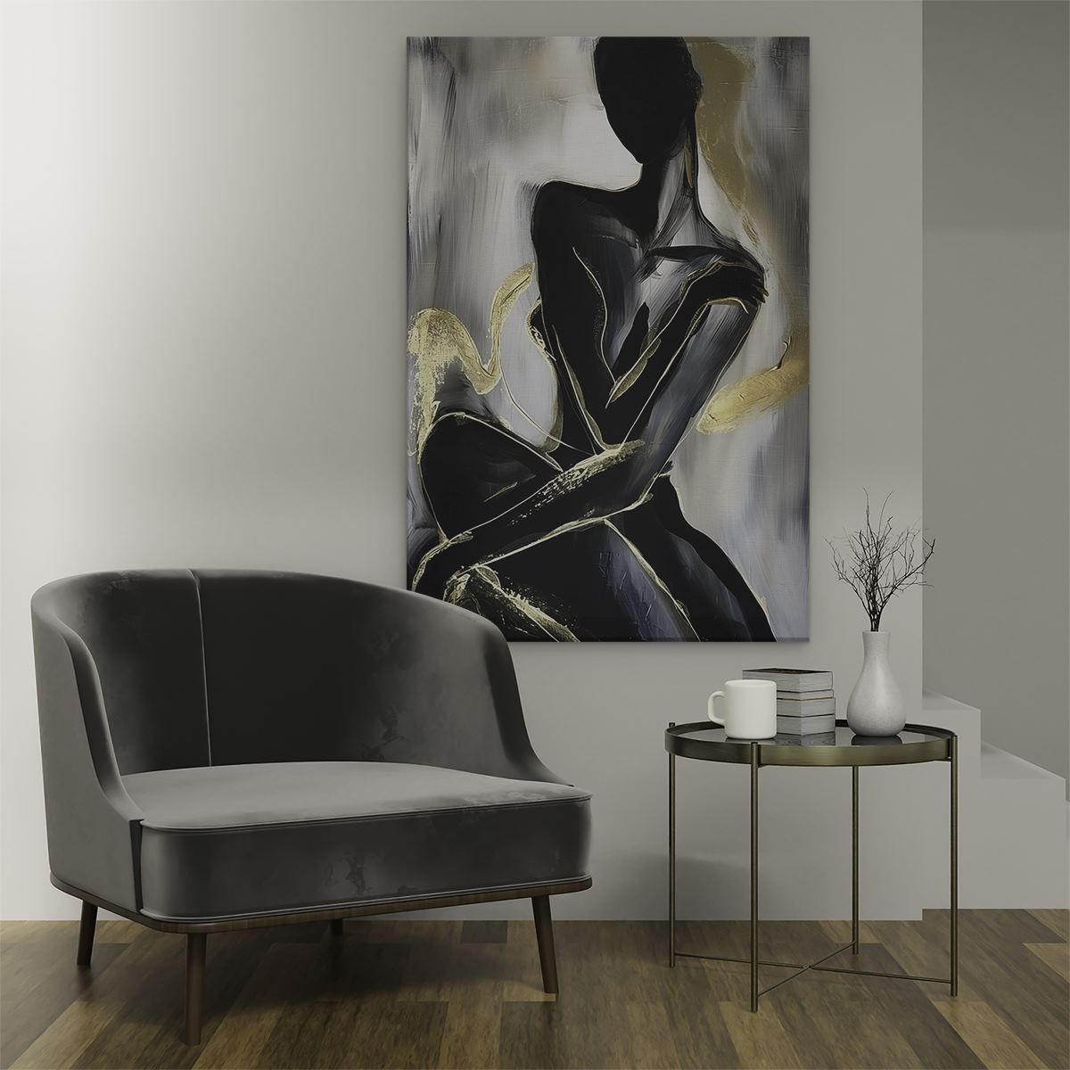 Schilderij Zwart en Goud Kunstwerk van een Vrouw