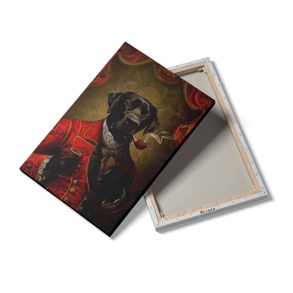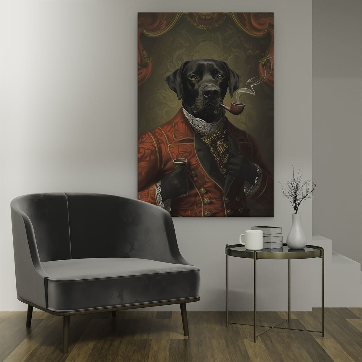 Schilderij Zwart Lab in een Rood Pak met een Pijp