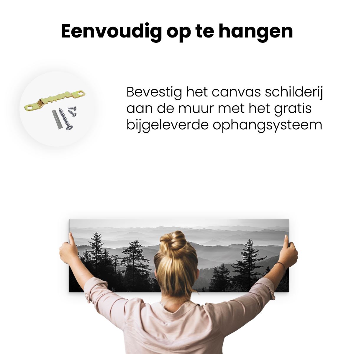 Bij aankoop ontvang je een meegeleverd ophangsysteem, zodat je op een simpele en snelle wijze het schilderij boven de bank of bed kan monteren.