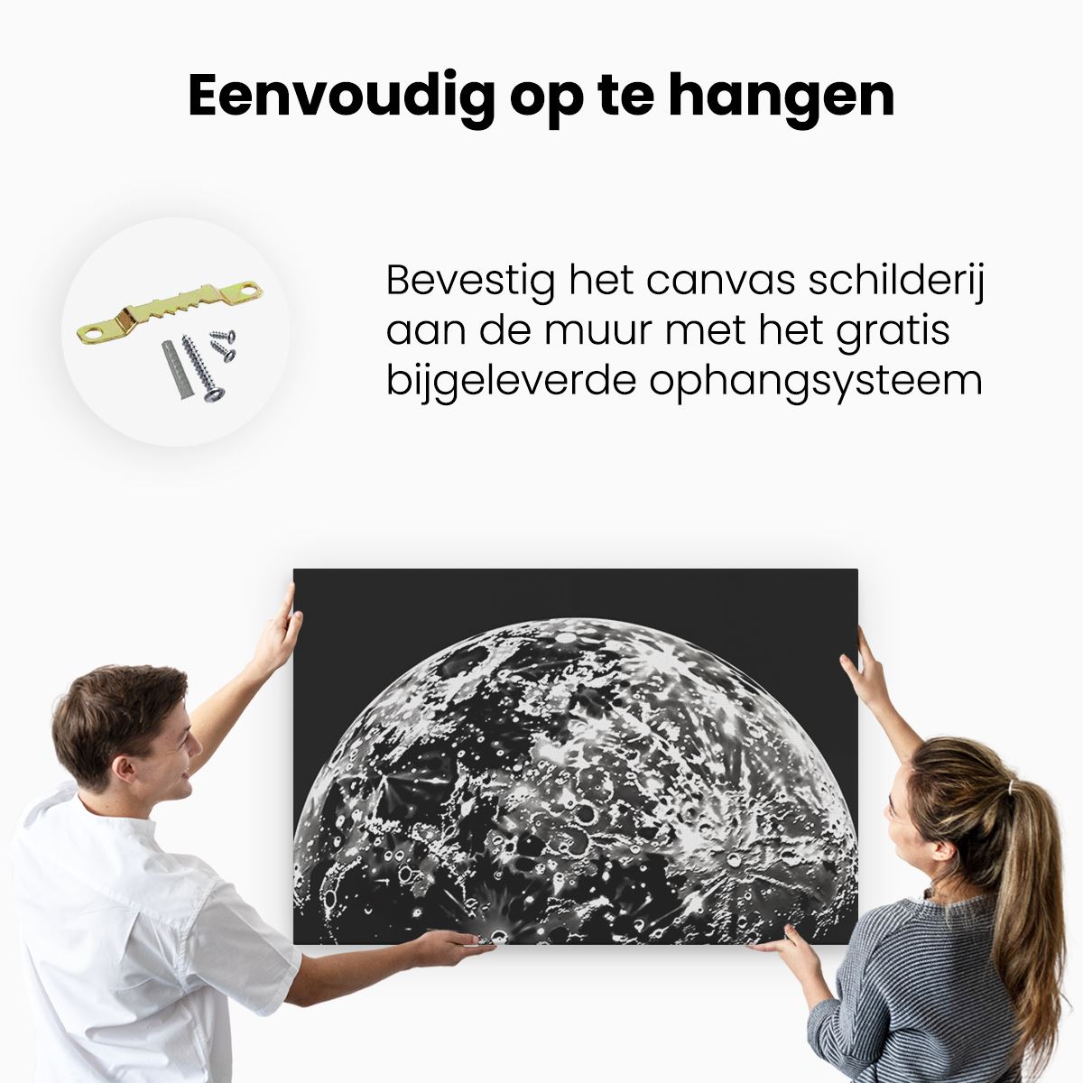 Bij aankoop ontvang je een meegeleverd ophangsysteem, zodat je op een simpele en snelle wijze het schilderij boven de bank of bed kan monteren.