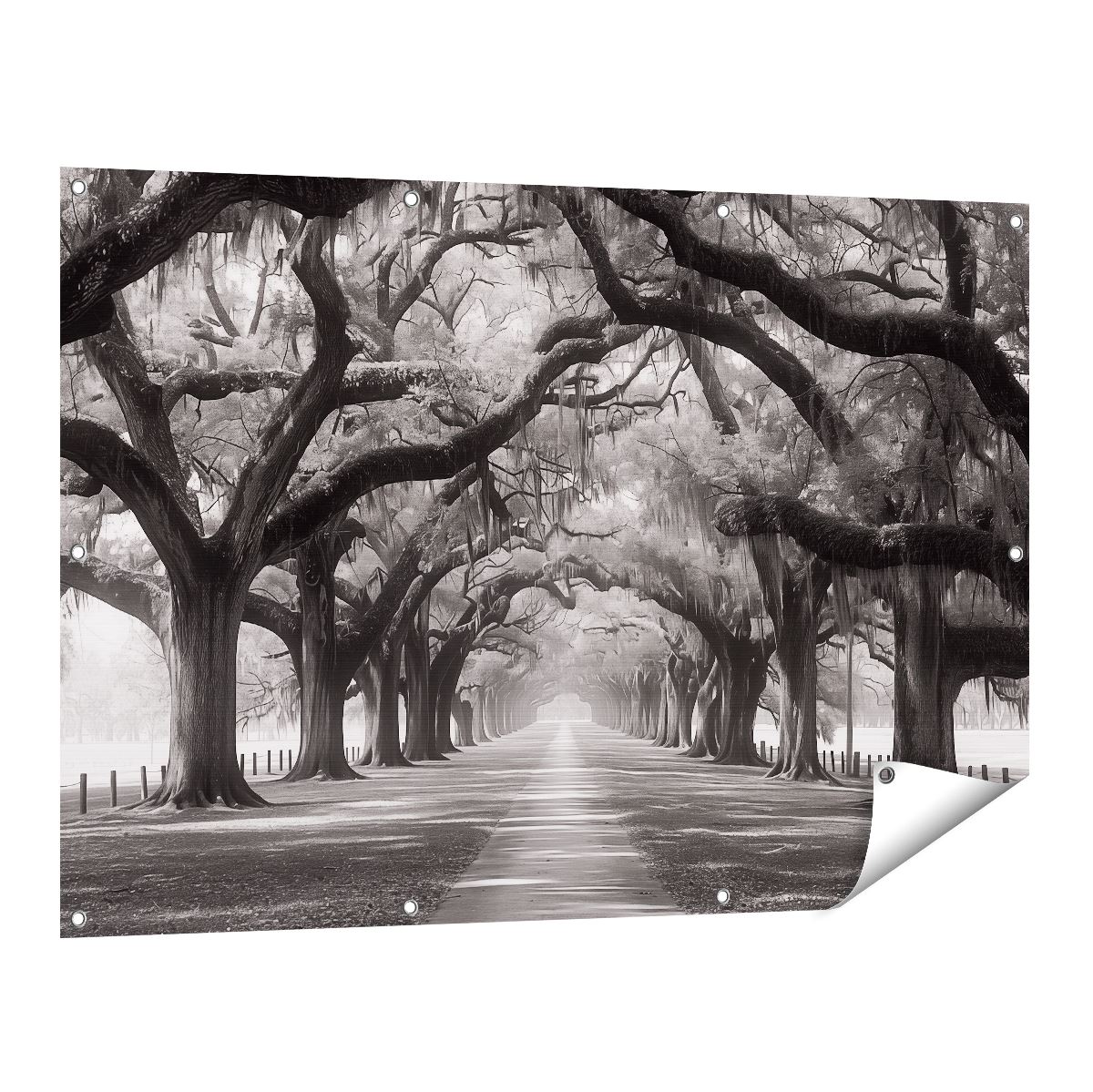 Tuinposter Zwart Wit Beeld van een met Bomen Omzoomd Pad