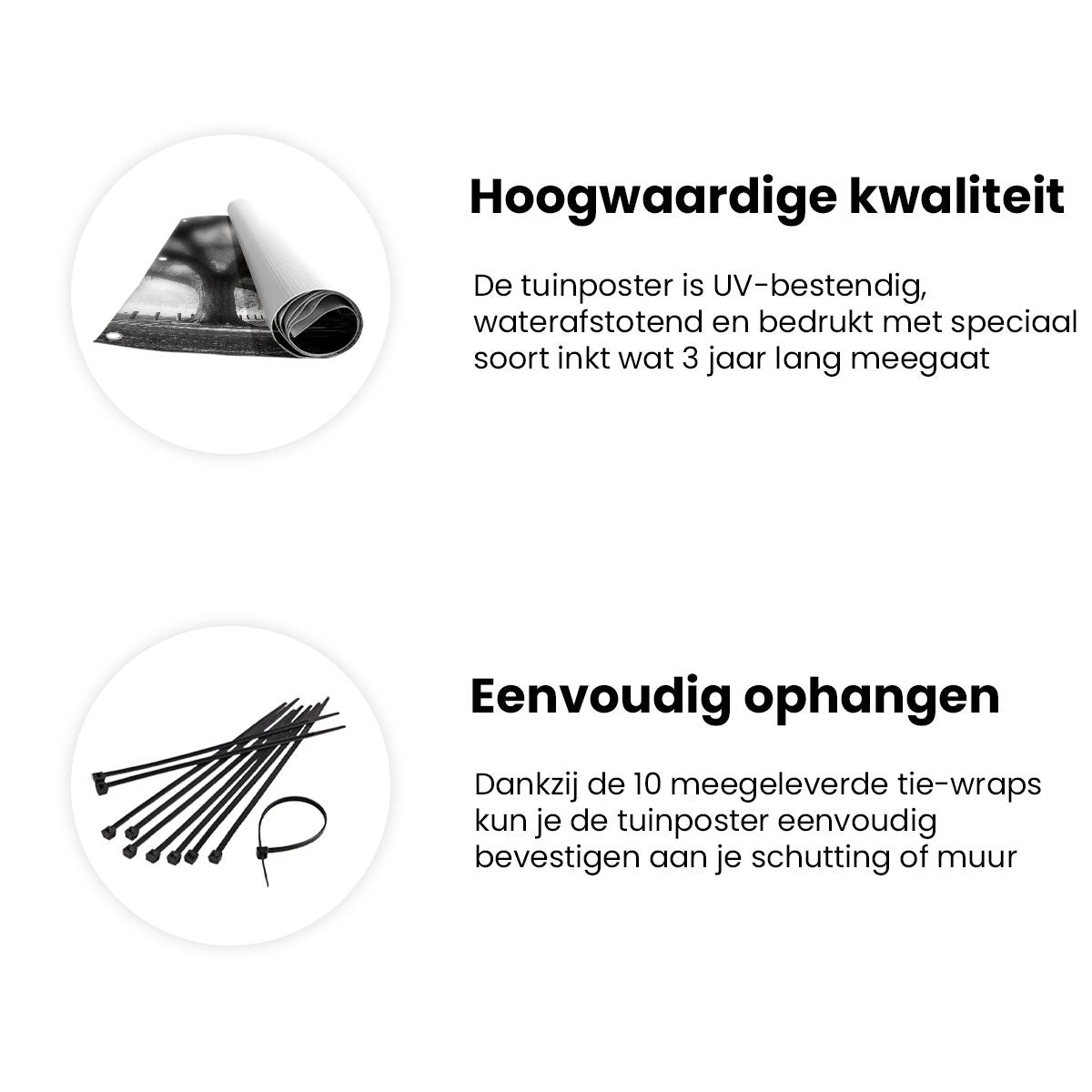 Bij aankoop ontvang je een meegeleverd ophangsysteem, zodat je op een simpele en snelle wijze de tuinposter kan ophangen.