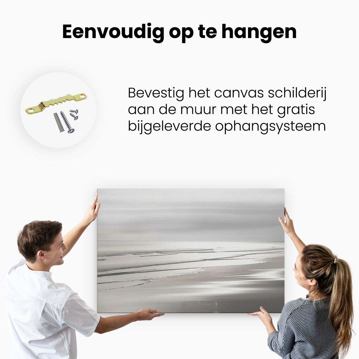 Bij aankoop ontvang je een meegeleverd ophangsysteem, zodat je op een simpele en snelle wijze het schilderij boven de bank of bed kan monteren.