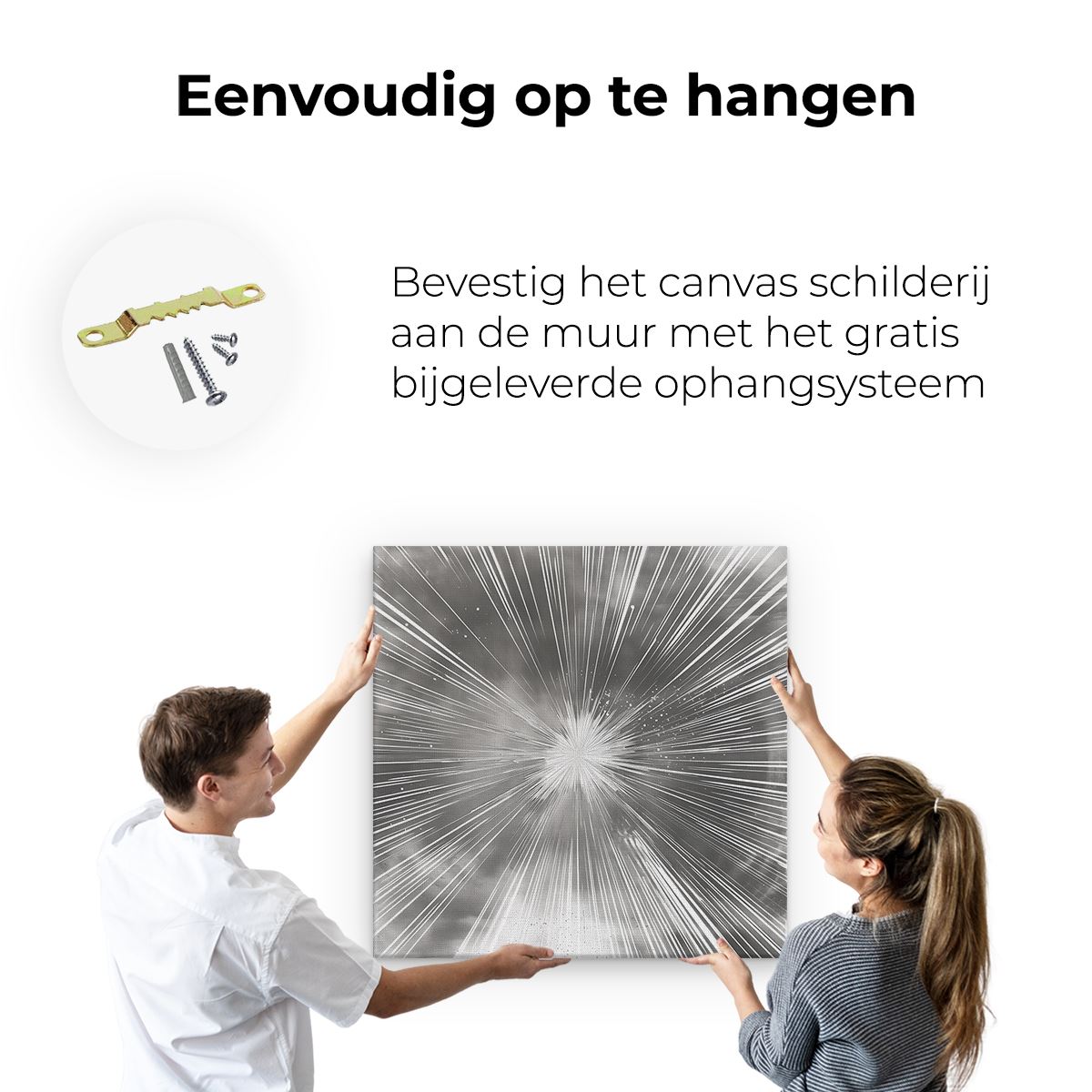 Bij aankoop ontvang je een meegeleverd ophangsysteem, zodat je op een simpele en snelle wijze het schilderij boven de bank of bed kan monteren.