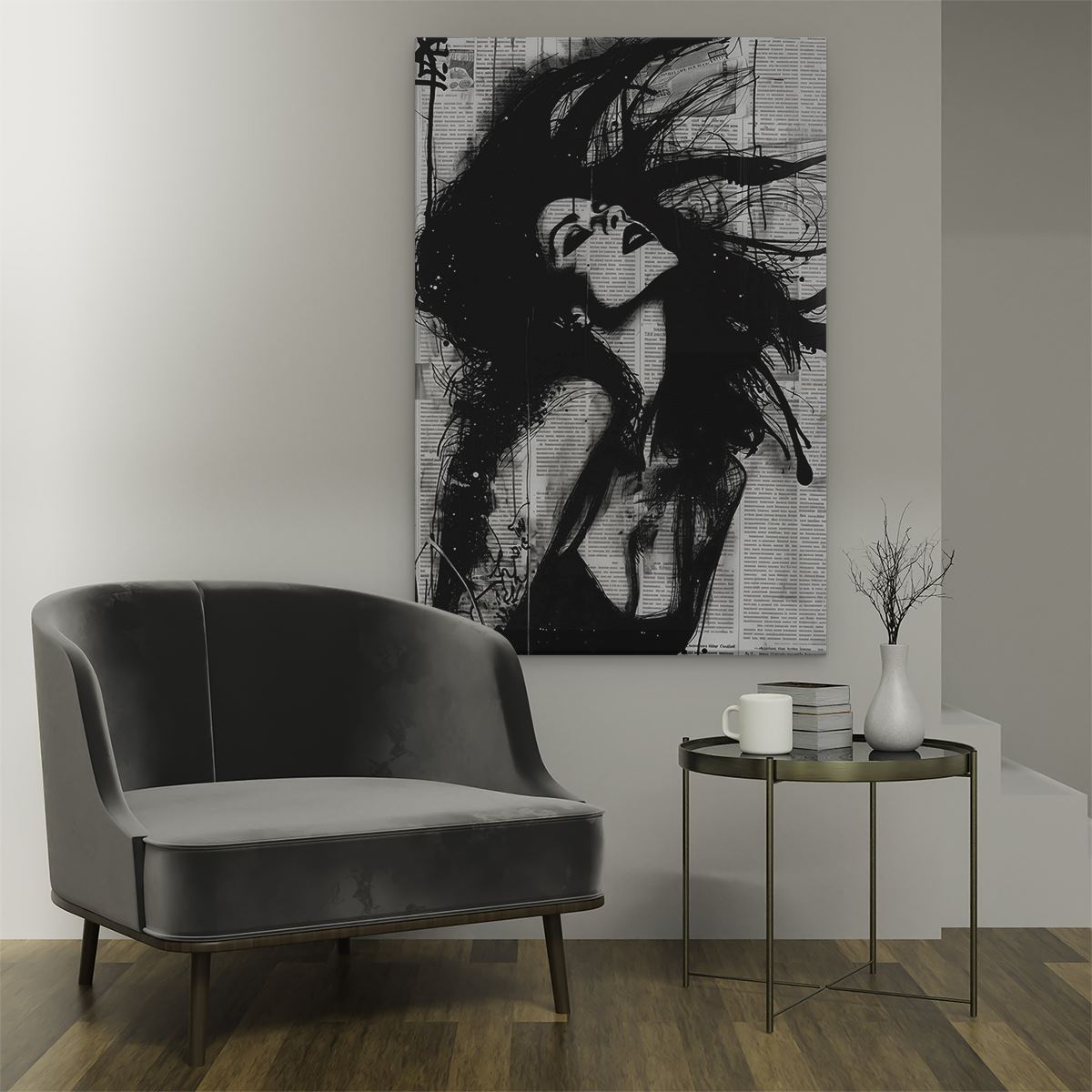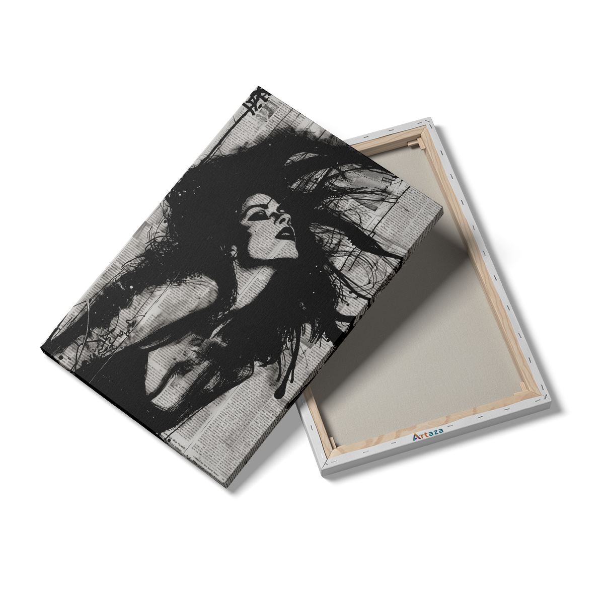 Schilderij Zwart Wit Beeld van een Vrouw met haar Haren Wapperend in de Wind